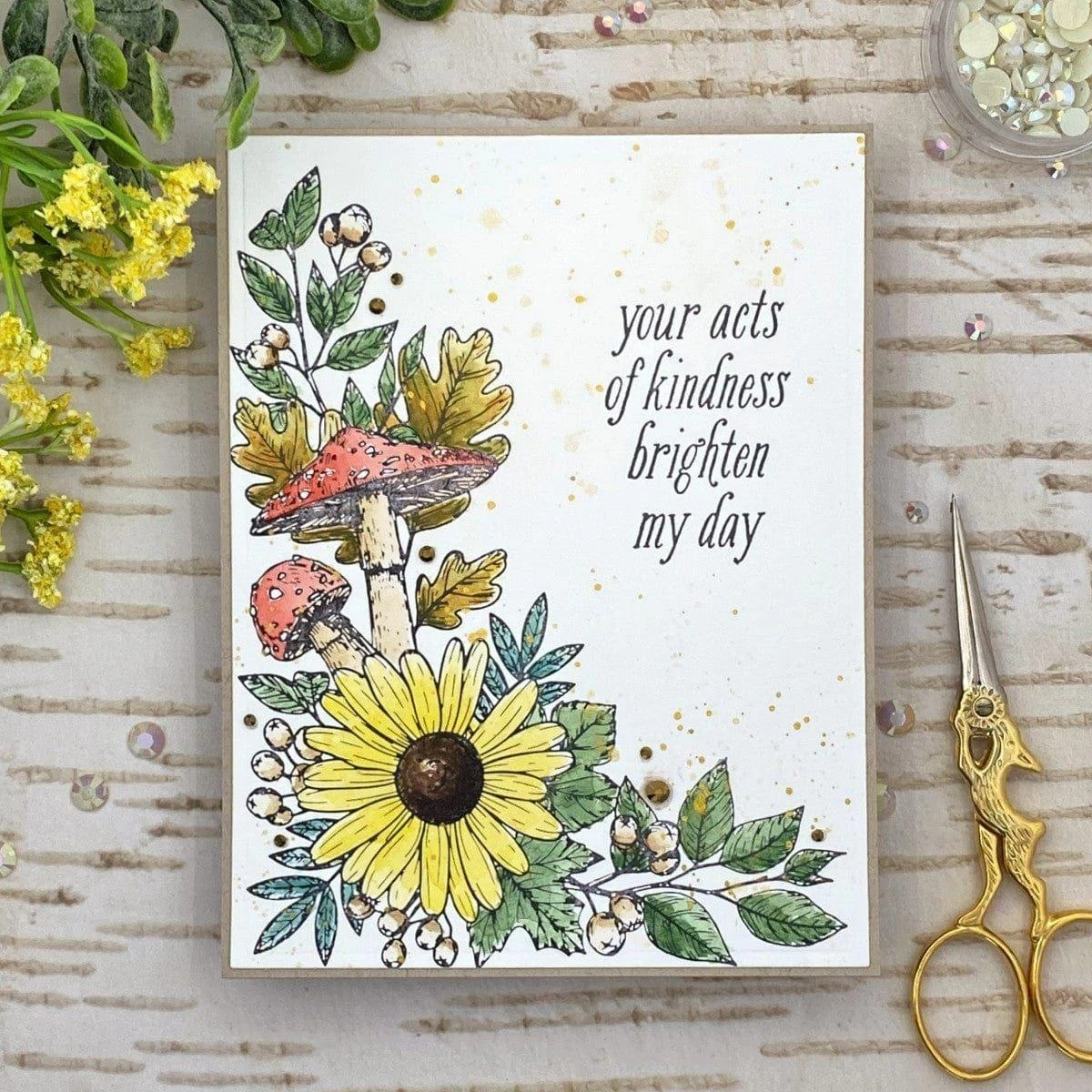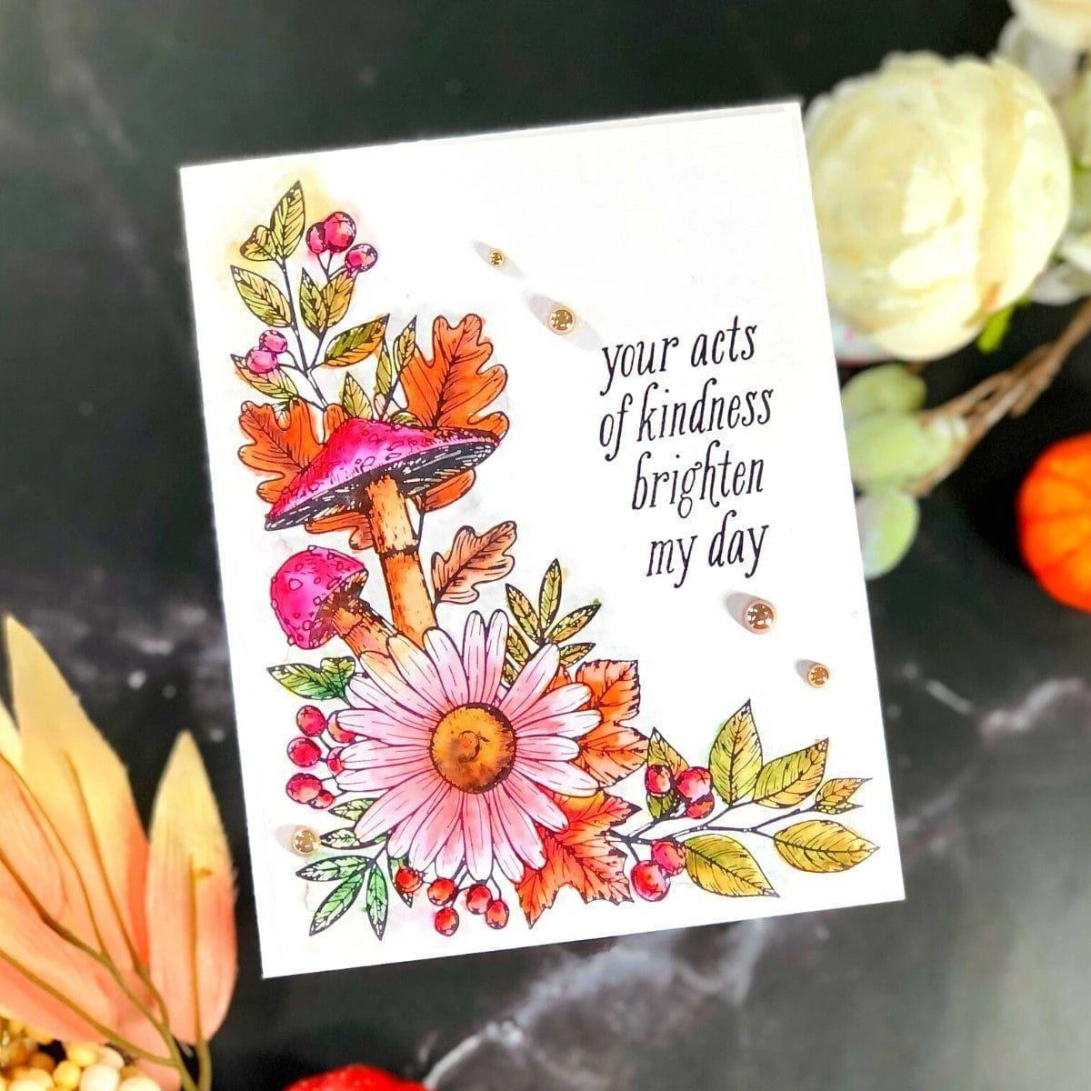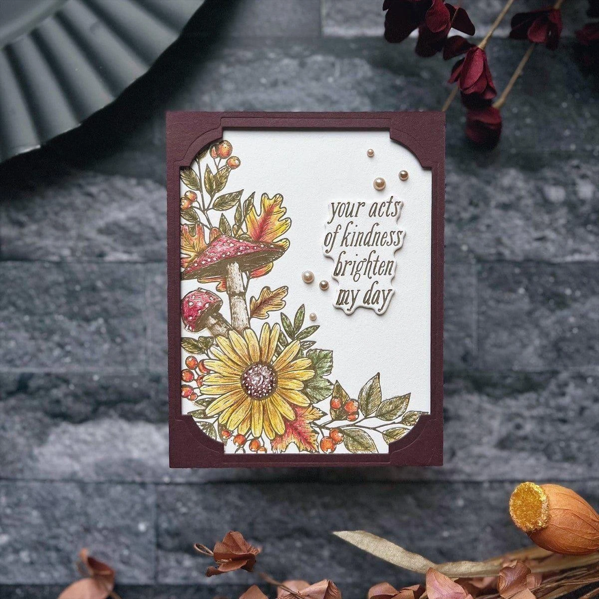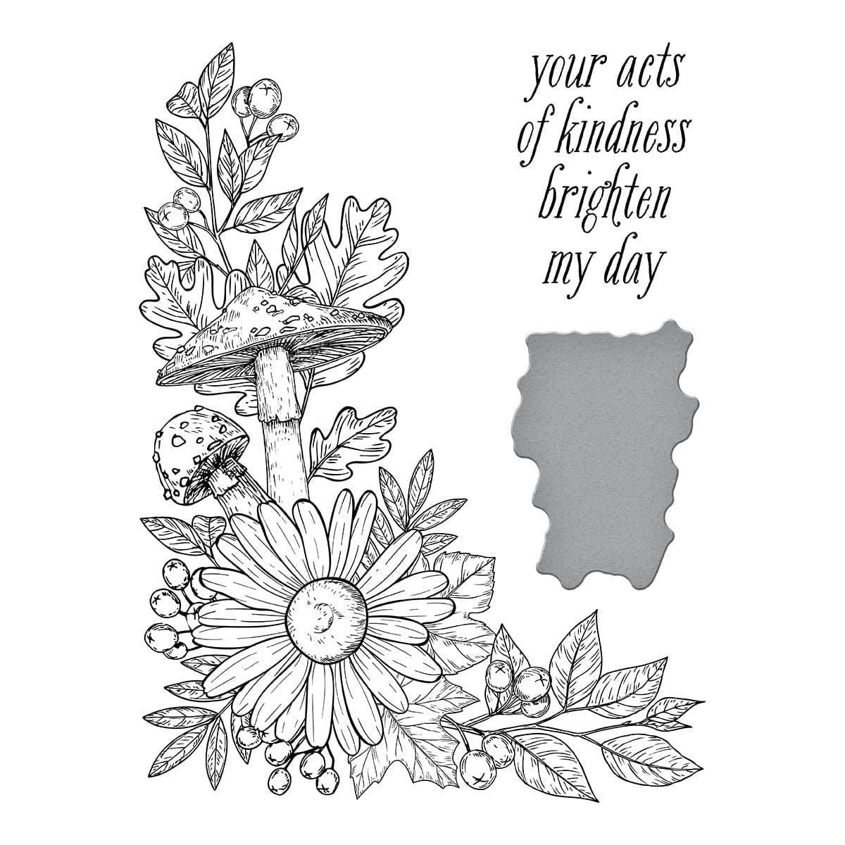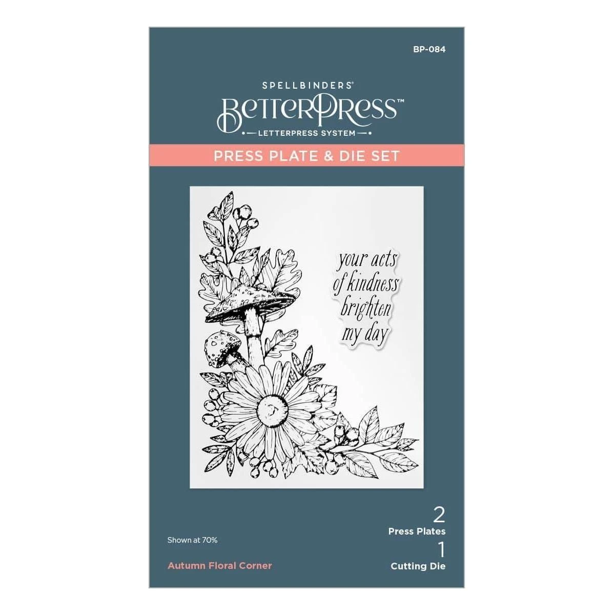 Autumn Floral Corner Press Plate & Die Set is from the BetterPress Autumn Collection. The corner motif has a wonderful combination of autumn leaves, flowers, and mushrooms. Fills most of an A2 size (4.25 x 5.50 in.) card front…just beautiful! This set of two press plates and one thin metal cutting die includes the corner design, as well as a sentiment and its outline die to cut and make it stand out. Ink the plates with BetterPress Ink to be pressed against the BetterPress Cotton Card Panel and Sheets for a crisp letterpress design.