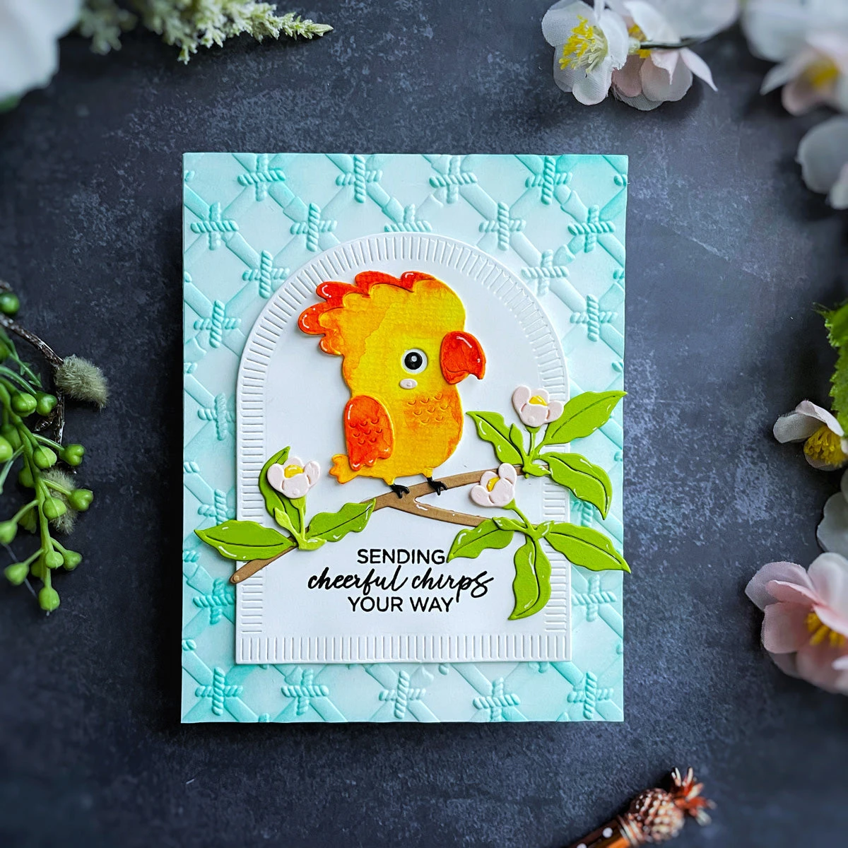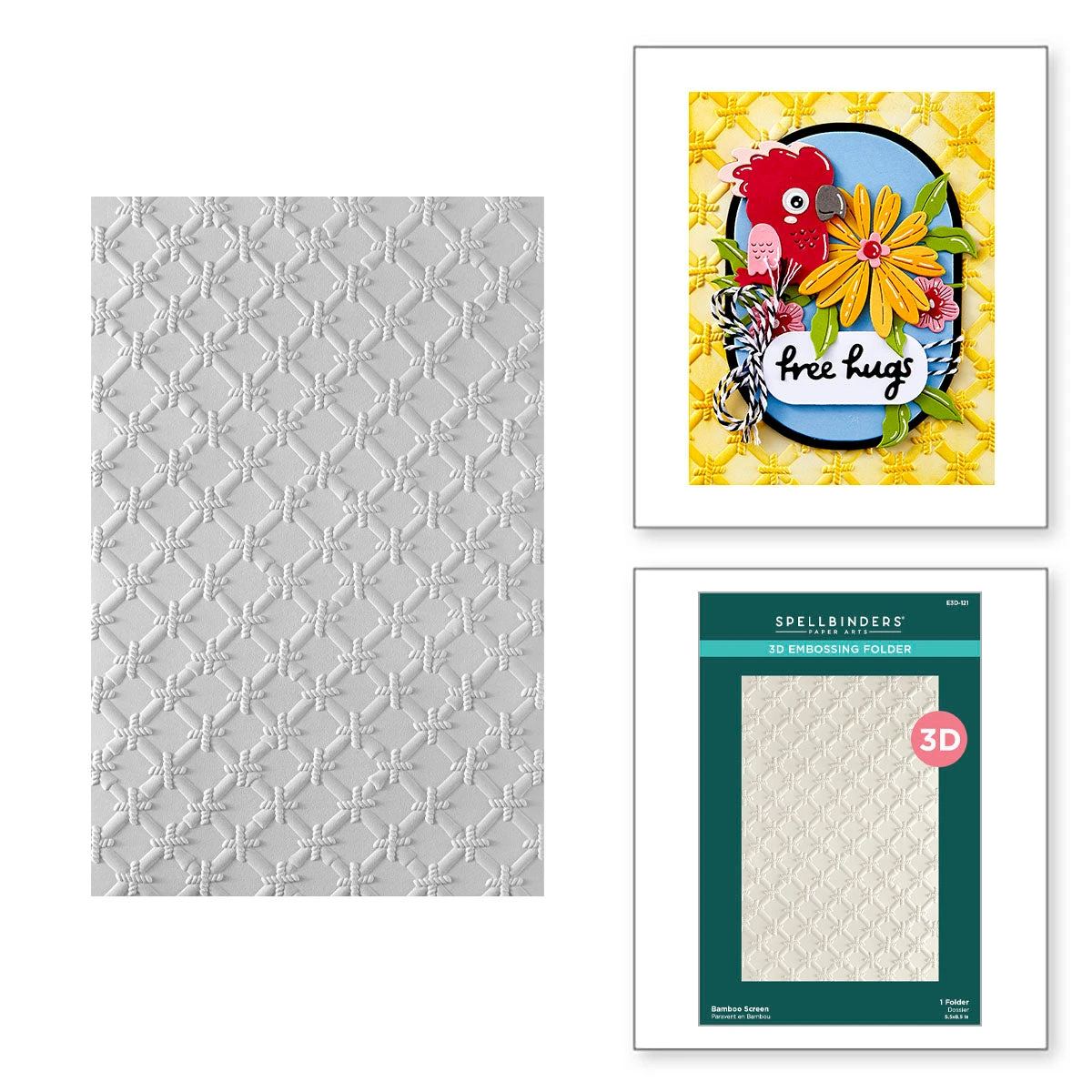 Bamboo Screen 3D Embossing Folder is a 5.50 x 8.50-inch embossing folder filled with a detailed bamboo lattice design. The folder is a great background for the sets in this collection.