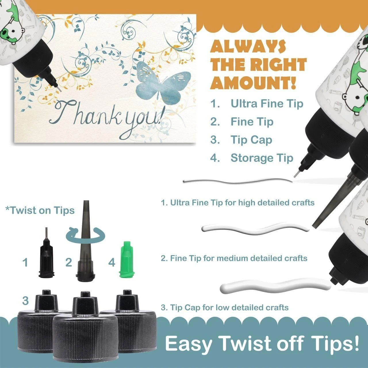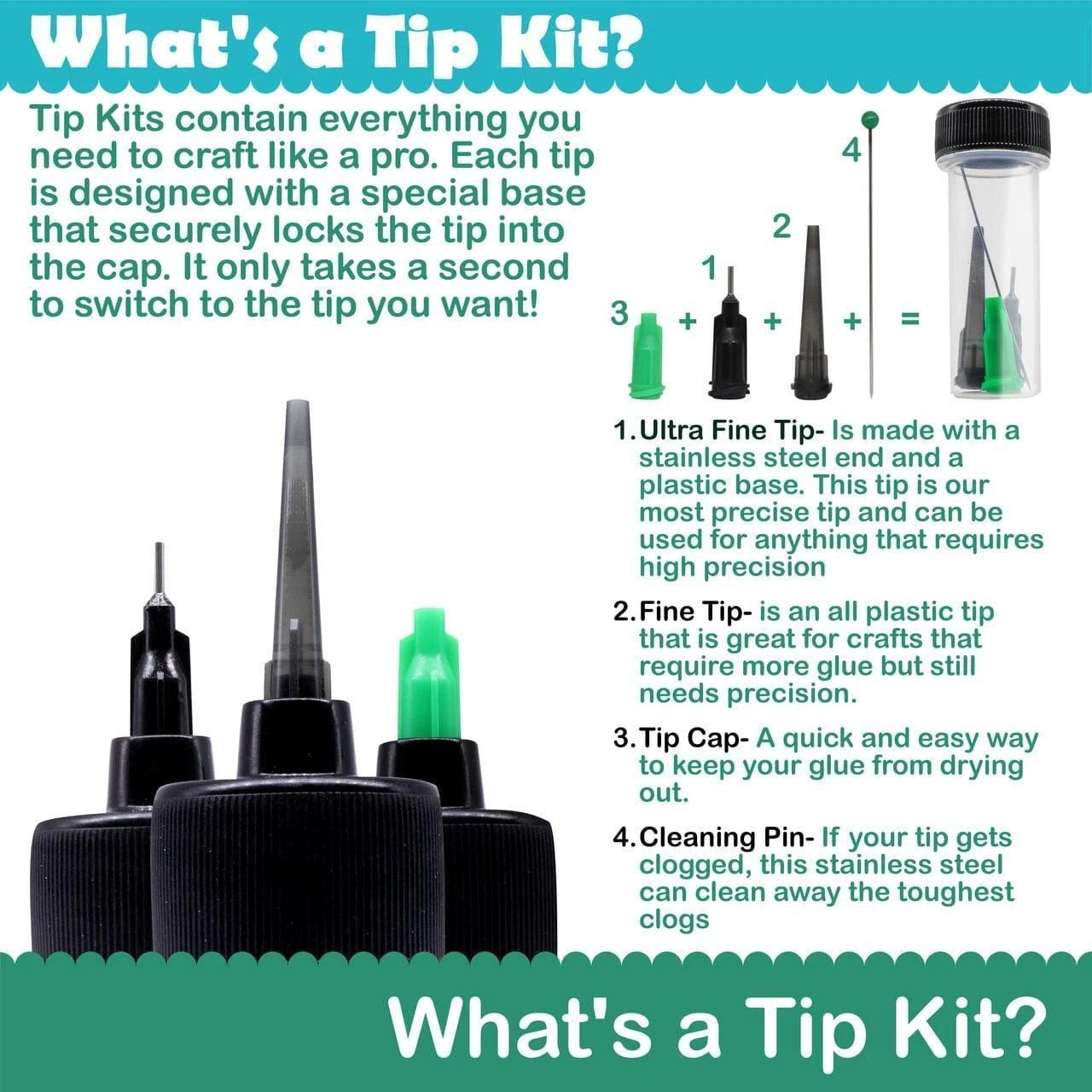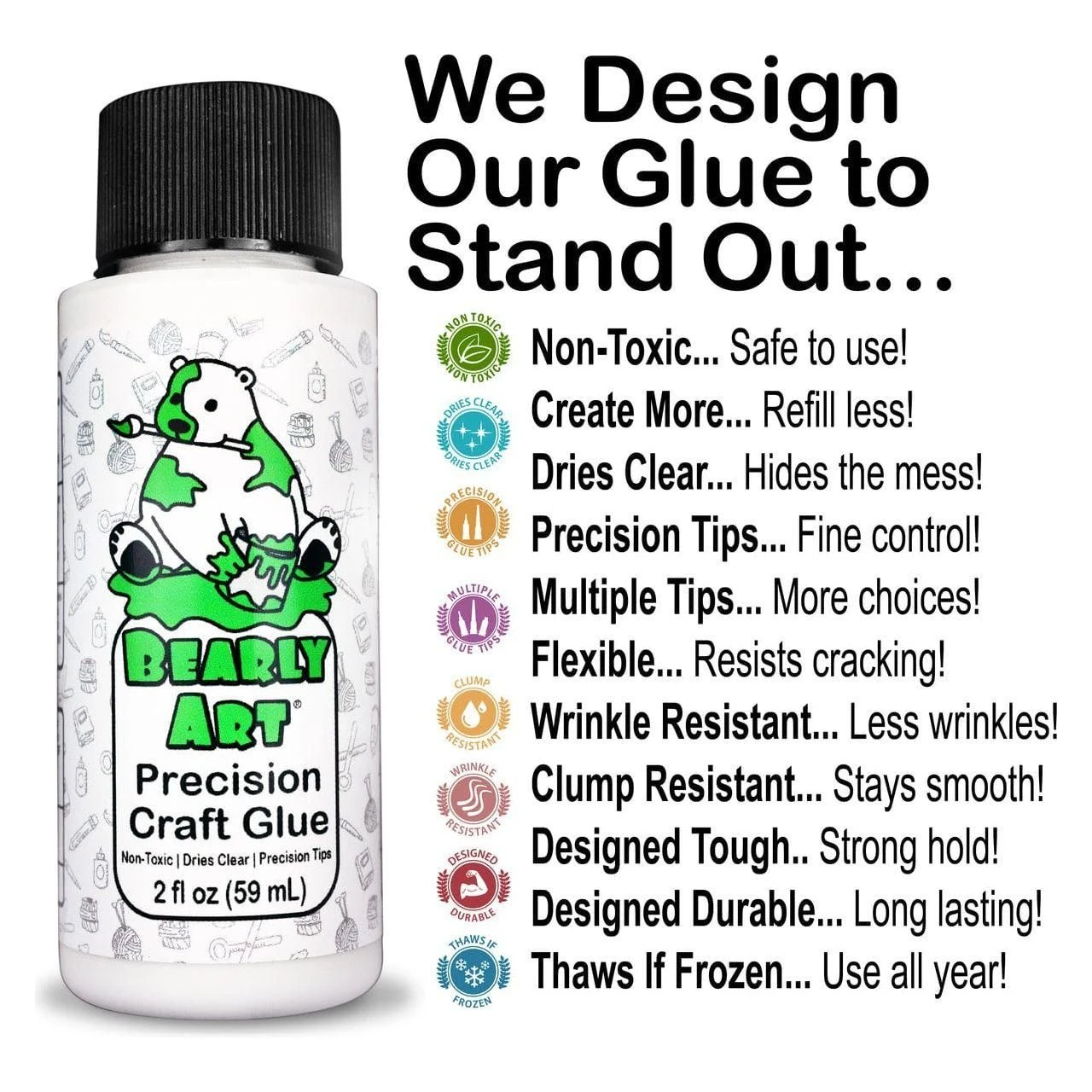 The Mini 2 fl. oz. Precision Craft Glue + Tip Kit comes in a 2 fl. oz. bottle with a tip kit. The non-toxic liquid glue dries clear, is wrinkle resistant and has a strong hold.
