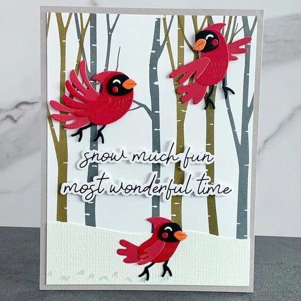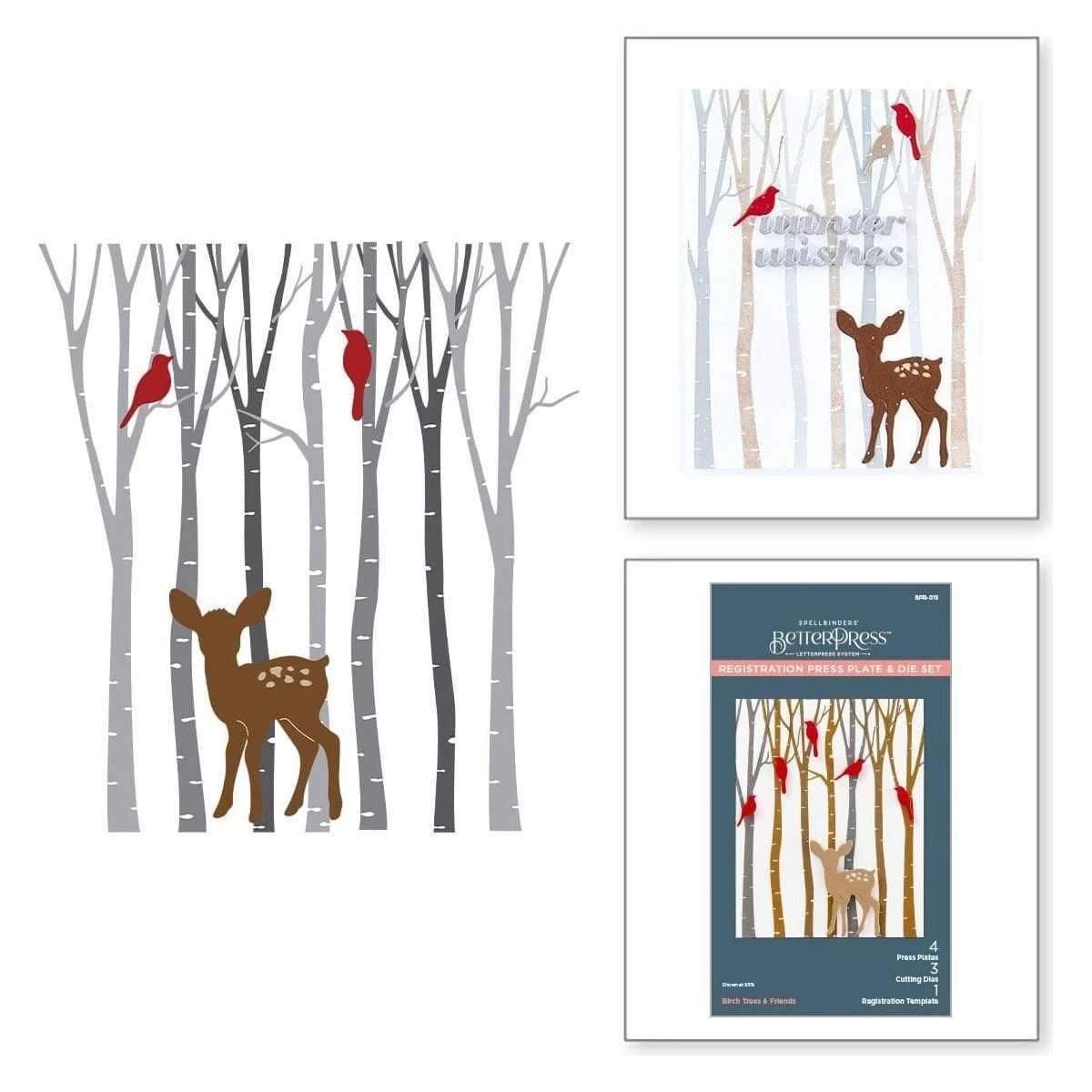Dies: Fawn: 1.65 x 2.20 in./4.10 x 5.60 cm Fawn Under Layer: 0.61 x 0.30 in./1.50 x 0.80 cm Right Facing Bird: 0.30 x 0.85 in./0.70 x 2.20 cm Left Facing Bird: 0.50 x 0.70 in./1.30 x 1.80 cm Plates: Tree 1: 1.50 x 5.50 in./3.80 x 14.00 cm Tree 2: 0.90 x 5.50 in./2.30 x 14.00 cm Tree 3: 1.35 x 5.50 in./3.40 x 14.00 cm Tree 4: 1.10 x 5.50 in./2.70 x 14.00 cm