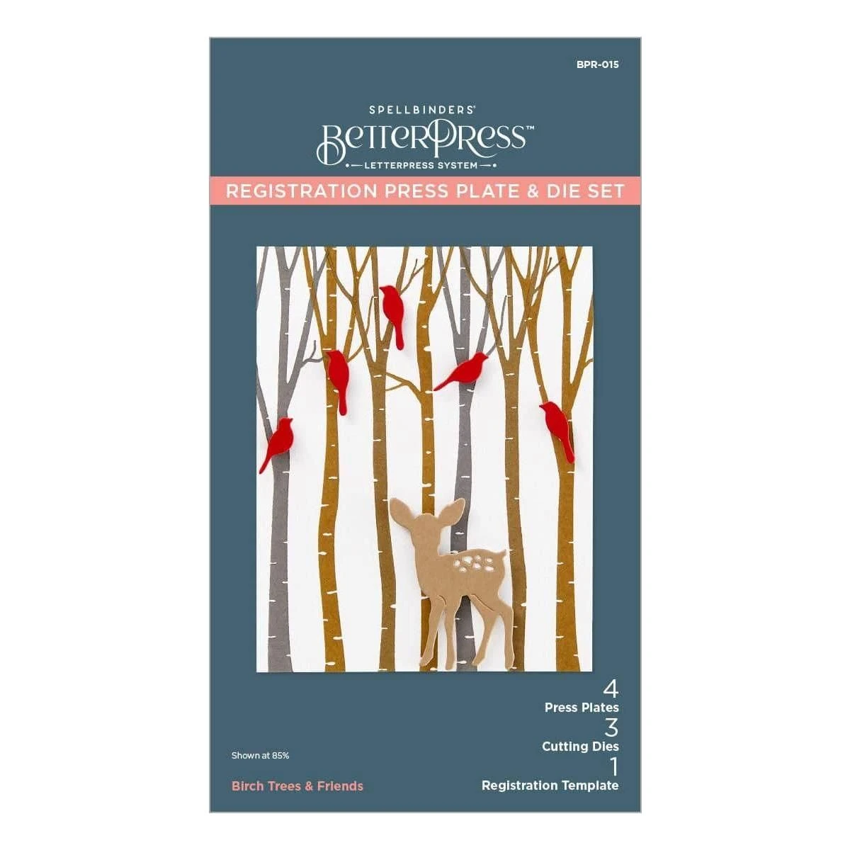 Birch Trees Registration Press Plates are part of the Dancin’ Christmas Friends Collection. With this set of four press plates, three thin metal cutting dies and one mylar printed registration template, it creates an adorable birch tree scene! Just add all the cute die-cut shapes to finish the design. Registration Press Plate sets make creating multi-color letterpress designs simple and foolproof! Simply follow the multi-colored mylar template to layer beautiful colors onto your BetterPress paper for a stunning effect. This clever innovation enhances your letterpress abilities to the next level.