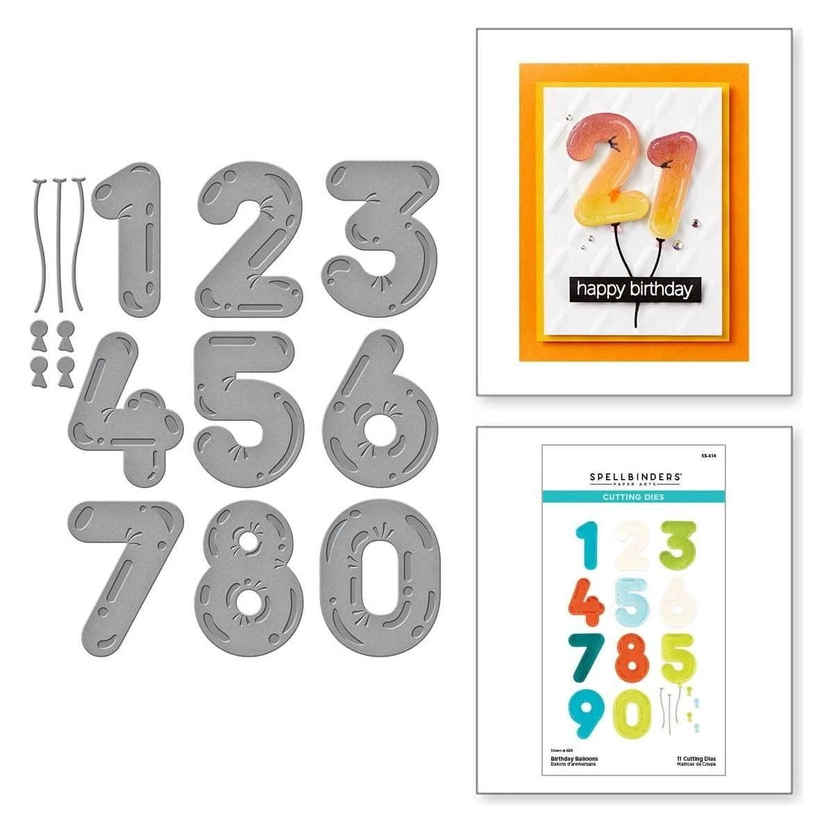 Birthday Balloons Etched Dies is from the Monster Birthday Collection and a fun assembly of numbered balloons. There are 11 thin metal cutting dies to help make a complete balloon from the number to the knot to the string. A wonderful set to have any milestone occasions like anniversary, graduation and more!