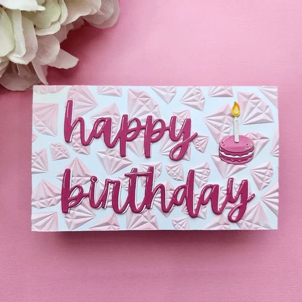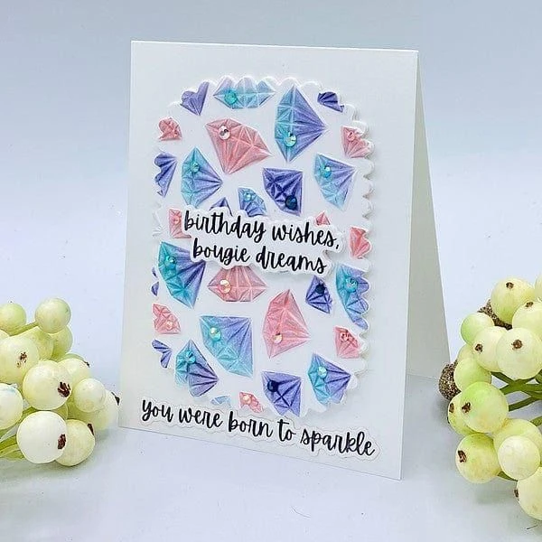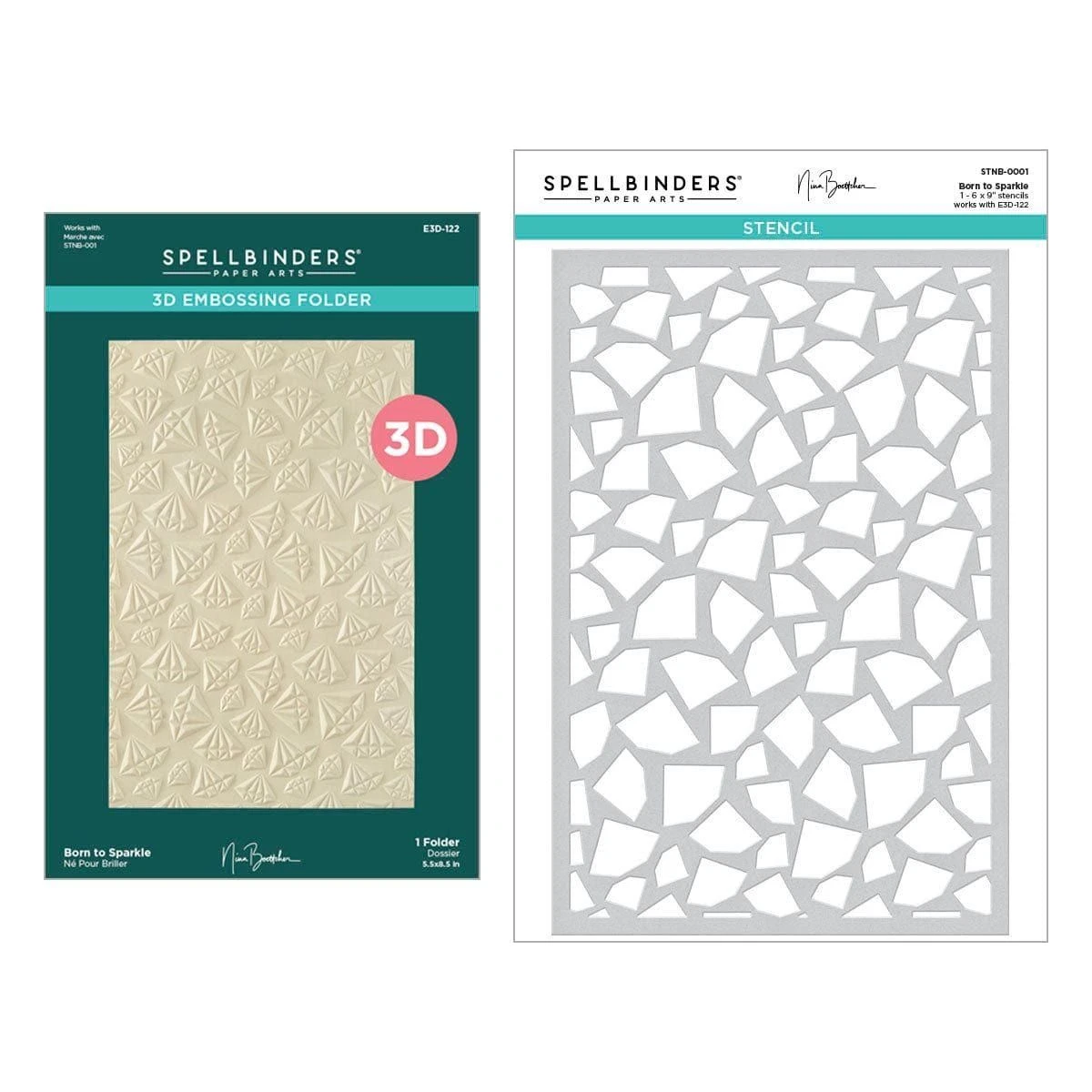 Born to Sparkle Emboss and Stencil Bundle is part of the Bougie Birthday Collection by Nina Boettcher. It includes E3D-122 Born to Sparkle 3D Embossing Folder and the matching stencil. Note that the stencil is exclusive to the bundle and will not be sold separately. The 3D embossing folder is filled with floating gemstones! What a fabulous addition to bring luxury and perfect to mix and match with the other sets in this collection! Use the matching Diamonds Stencil to highlight each gem with inks, pastes and other mediums.