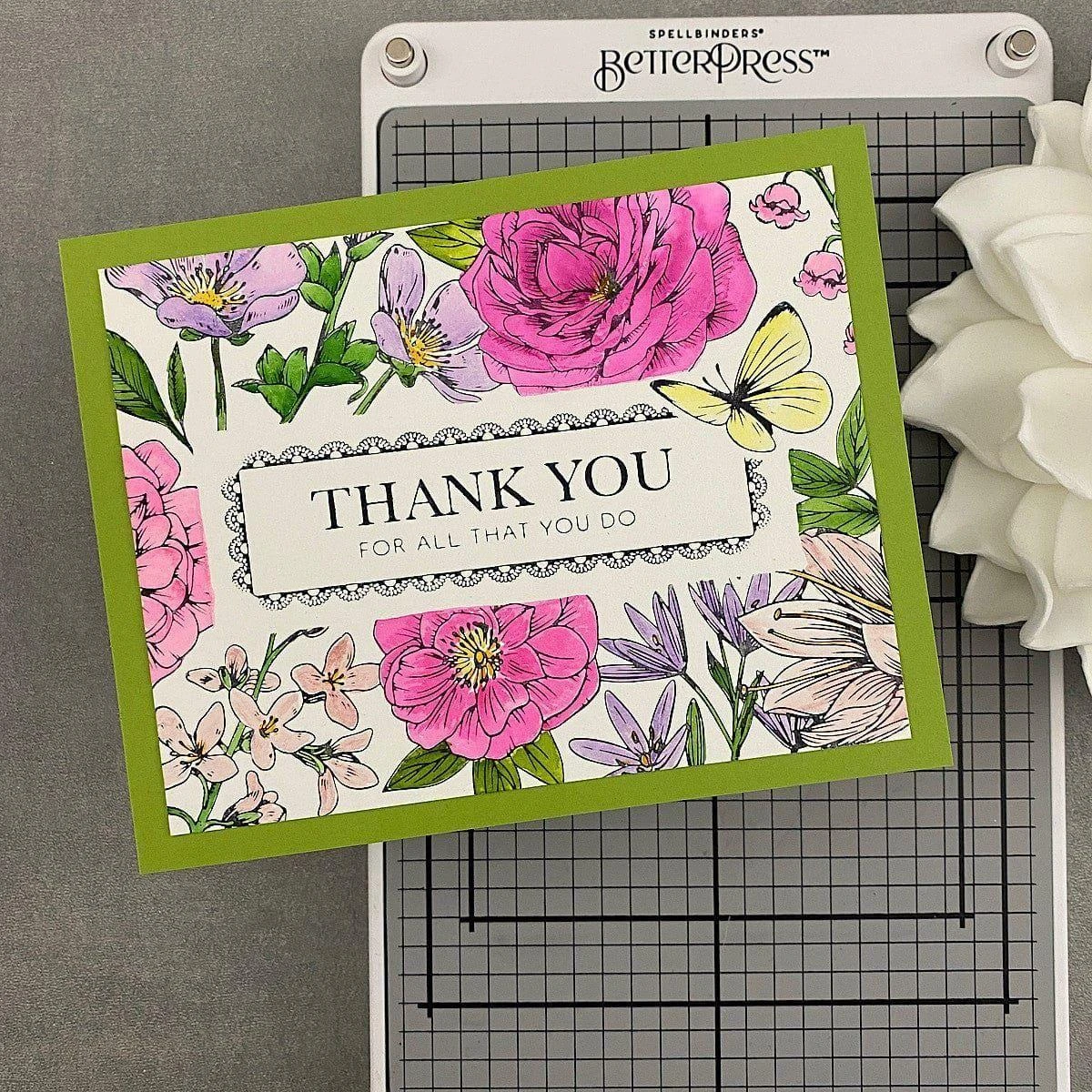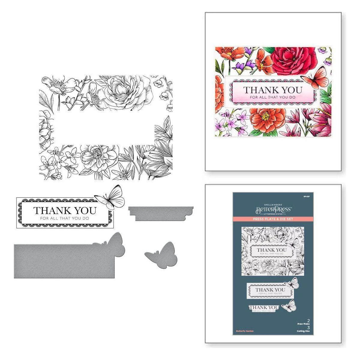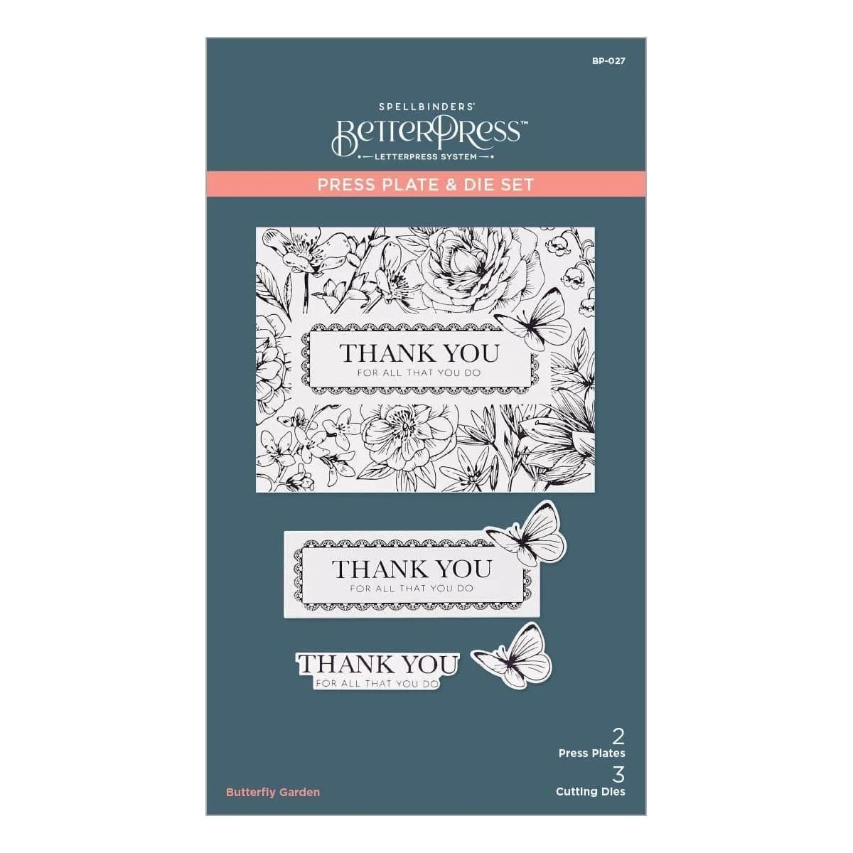 Butterfly GardenPress Plate & Die Set is from the BetterPress Collection by Spellbinders includes a lovely floral A2 size background design and a framed thank you sentiment plate. There are three thin metal cutting dies that cut the sentiment two ways – the entire plate with butterfly, the sentiment only, and a butterfly shape. Ink the plate with the BetterPress Ink to be pressed against the BetterPress Cotton Card Panel and Sheets to create a crisp letterpress design.