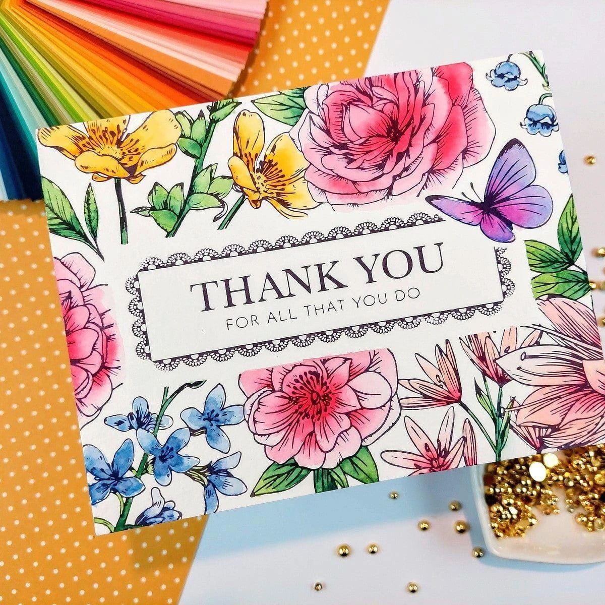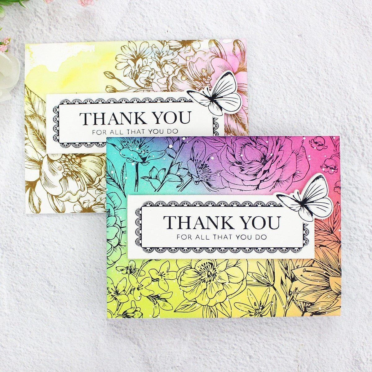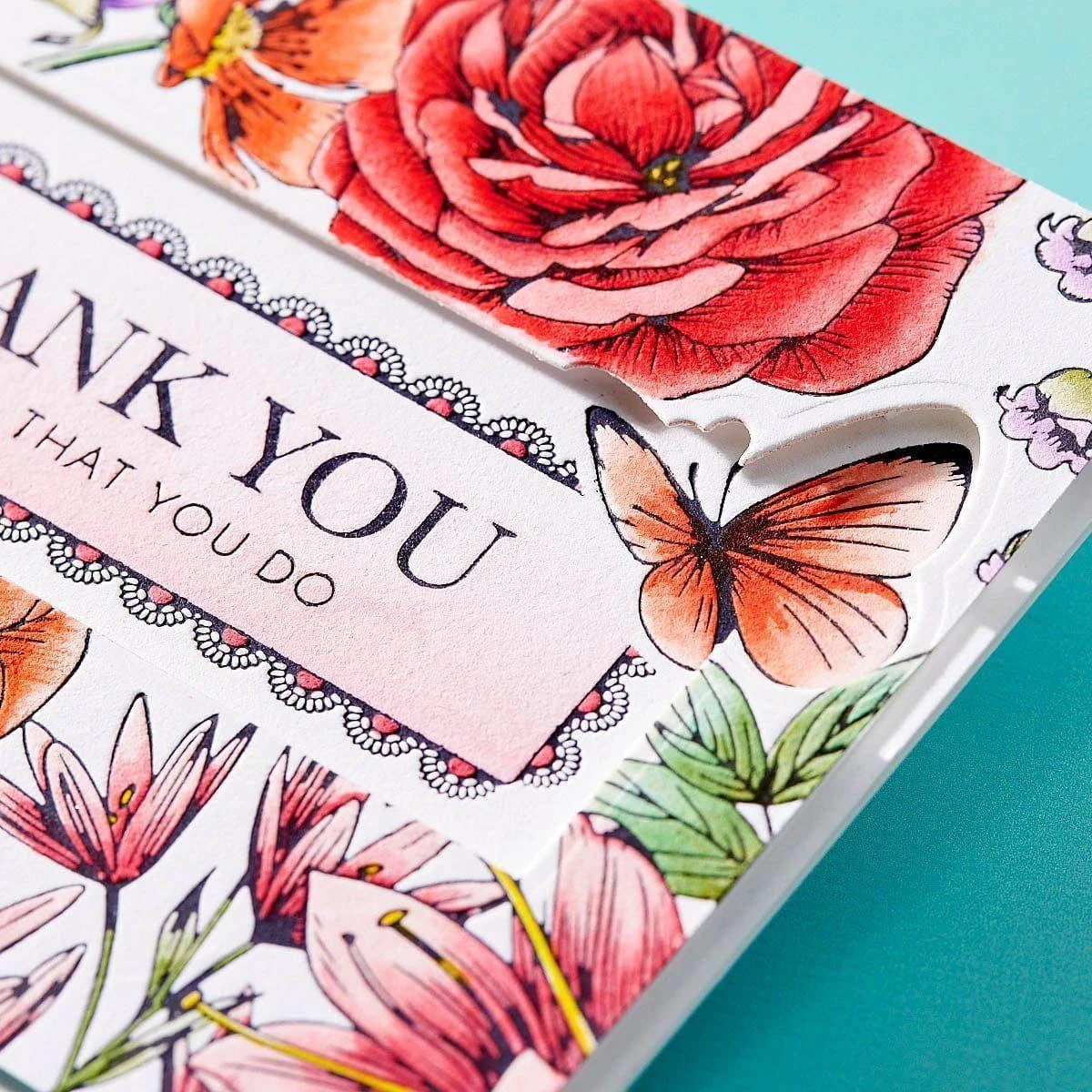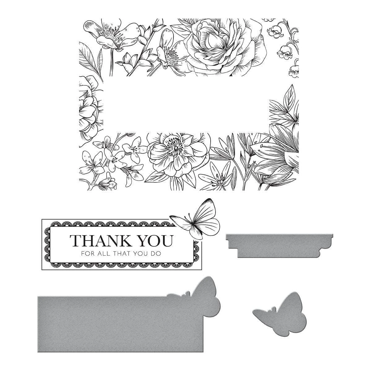 Butterfly GardenPress Plate & Die Set is from the BetterPress Collection by Spellbinders includes a lovely floral A2 size background design and a framed thank you sentiment plate. There are three thin metal cutting dies that cut the sentiment two ways – the entire plate with butterfly, the sentiment only, and a butterfly shape. Ink the plate with the BetterPress Ink to be pressed against the BetterPress Cotton Card Panel and Sheets to create a crisp letterpress design.