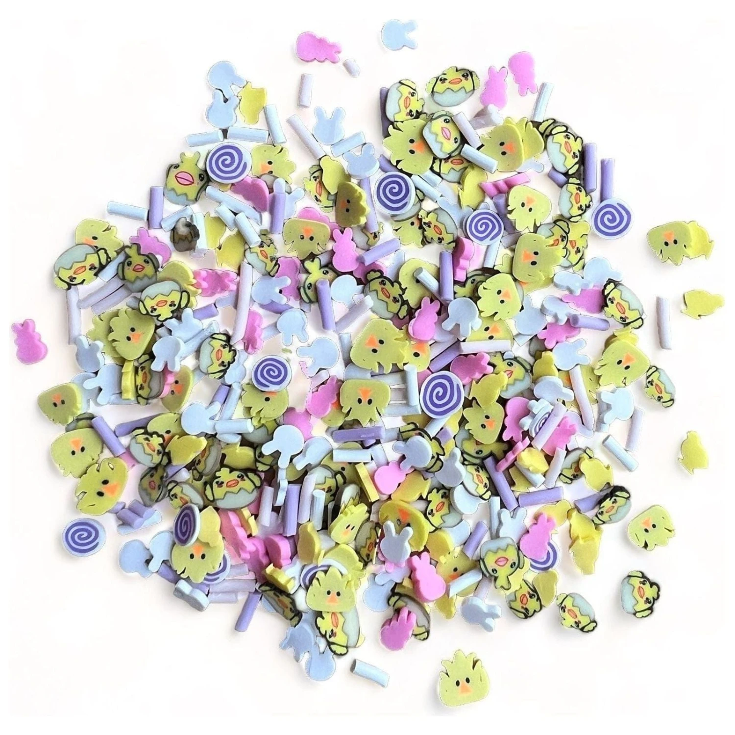 Fluffy Friends Sprinkletz is a craft embellishment mix from Buttons Galore and More.. These tiny polymer clay embellishments are shaped like Easter eggs, bunnies, chicks and other Easter icons and are perfect for adding a touch of fun to your projects. Each piece measures approximately 5mm, making them ideal for decorating cards, scrapbook pages, or other paper crafts. With approximately 12 grams, or around 600 pieces per pack, you’ll have plenty to choose from. These little embellishments can be glued onto almost any surface or used as shaker filler.