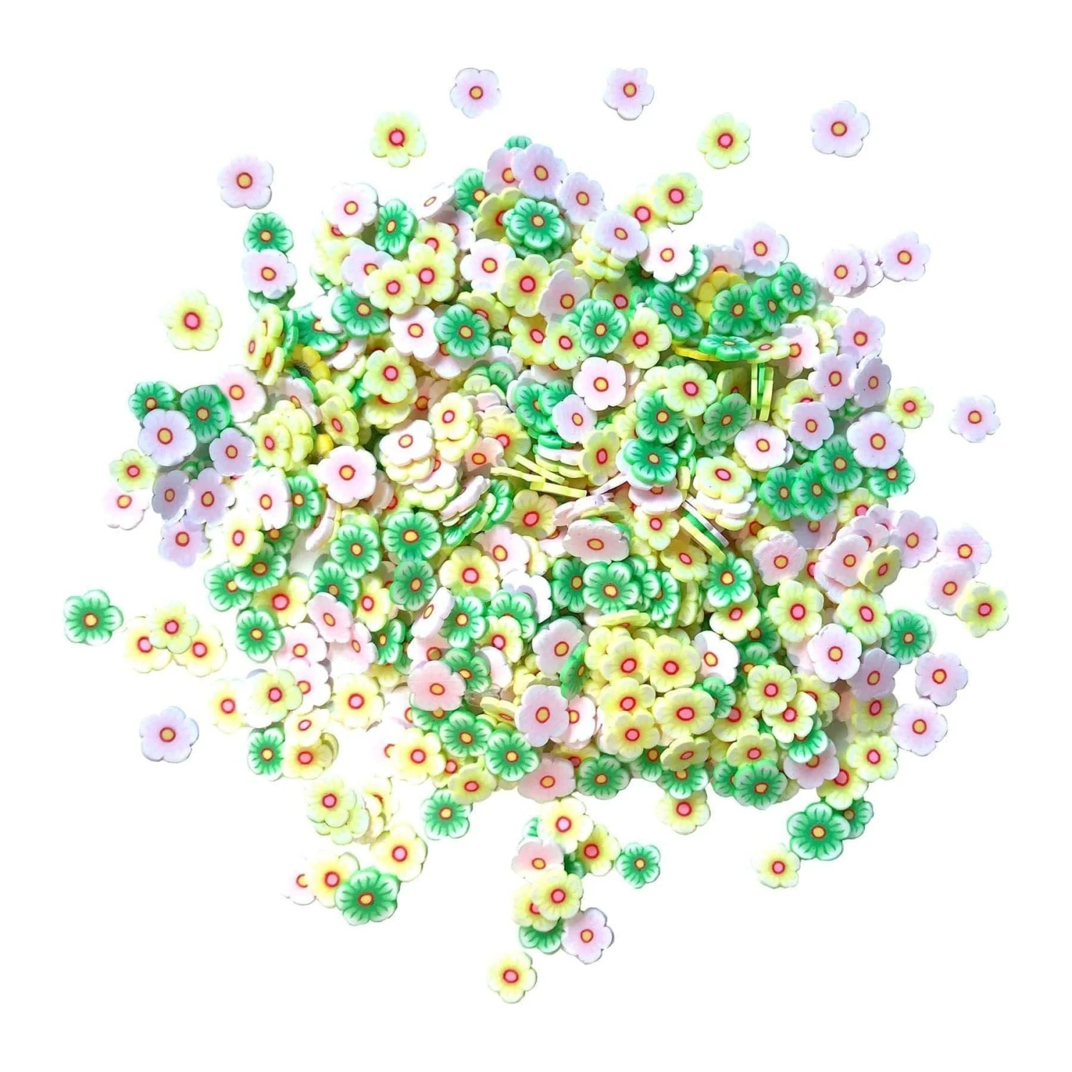 Pastel Blooms Sprinkletz is a craft embellishment mix from Buttons Galore and More. These tiny polymer clay embellishments are shaped like flowers of three different colors and are perfect for adding a touch of whimsy to your projects. Each piece measures approximately 5mm, making them ideal for decorating cards, scrapbook pages, or other paper crafts. With 12 grams, or approximately 600 pieces per pack, you’ll have plenty to choose from. These little embellishments can be glued onto almost any surface or used as shaker filler.