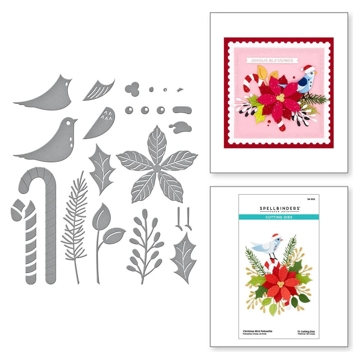 Christmas Bird Poinsettia Etched Dies are part of the Classic Christmas Collection by Spellbinders. This set of 13 thin metal cutting dies creates a sweet bird perched on top of a Poinsettia and candy cane bouquet. Use them together or separately, they create lovely holiday accents!