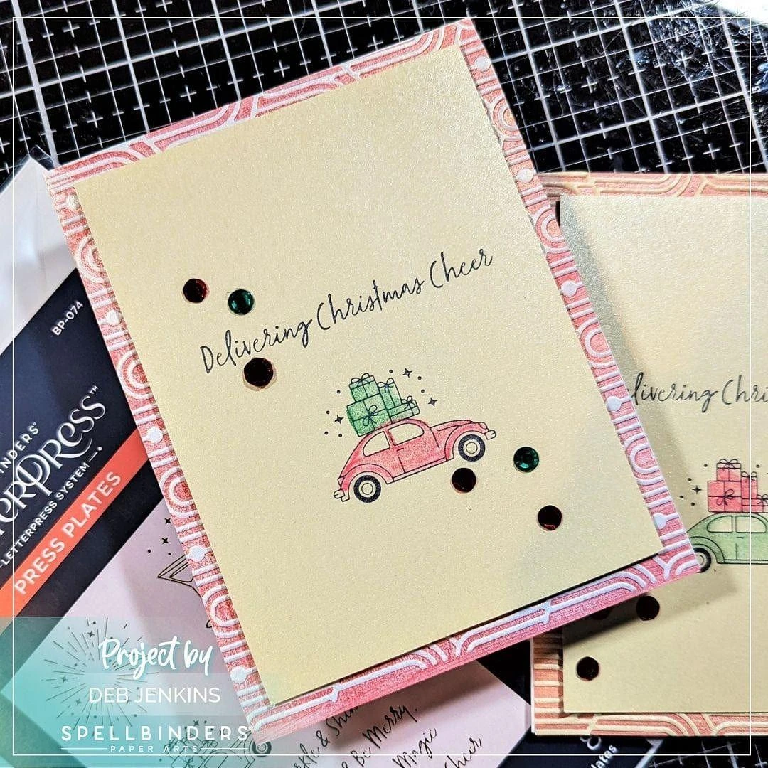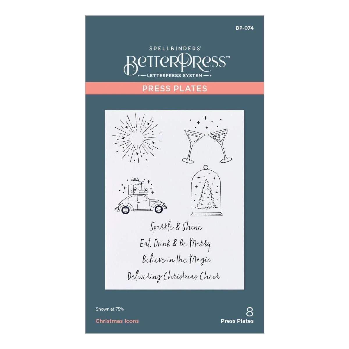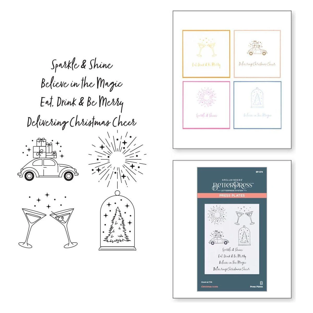 Christmas IconsPress Plate is part of the BetterPress Christmas Collection by Spellbinders. This set of eight press plates had all things of holiday motifs and four holiday-themed phrases. Phrases include Eat, Drink, & Be Merry, Sparkle & Shine, Believe in the Magic, and Delivering Christmas Cheer. The four contemporary style holiday designs are a starburst, gifts on top of the car, a bell jar and cocktail glasses toasting.