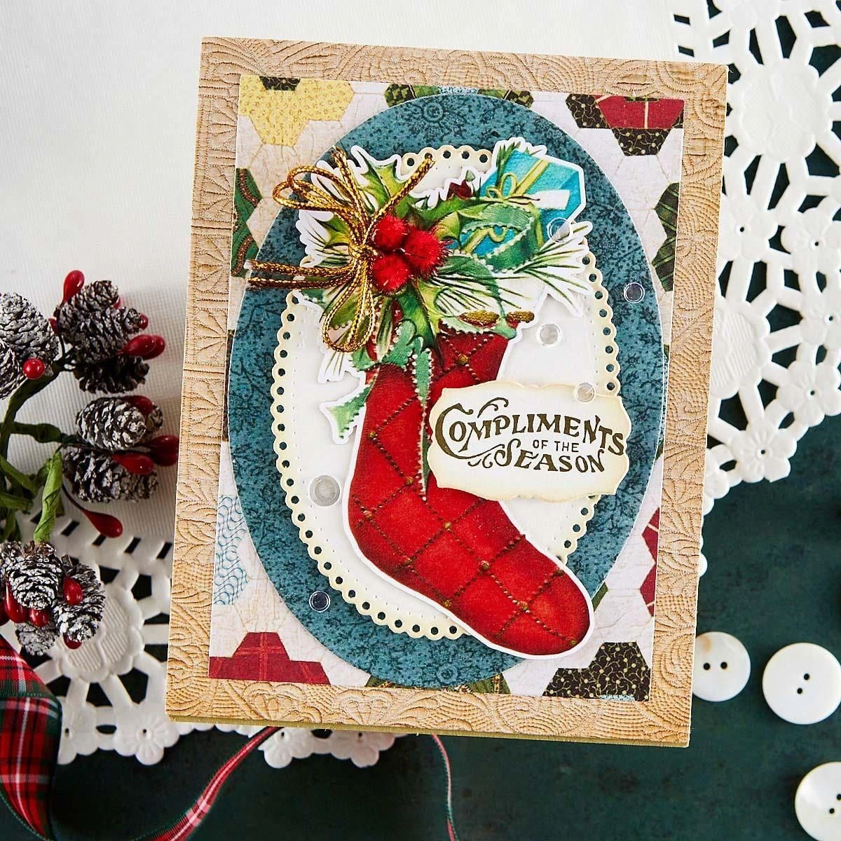 This Christmas Velvet 6 x 9″ Paper Pad is part of the Christmas Flea Market Finds Collection by Cathe Holden. It has 24 sheets of patterned papers (two each of 12 designs). The papers are full of warm holiday color combinations of red, green and tan with unique designs from postcards, frames and more.