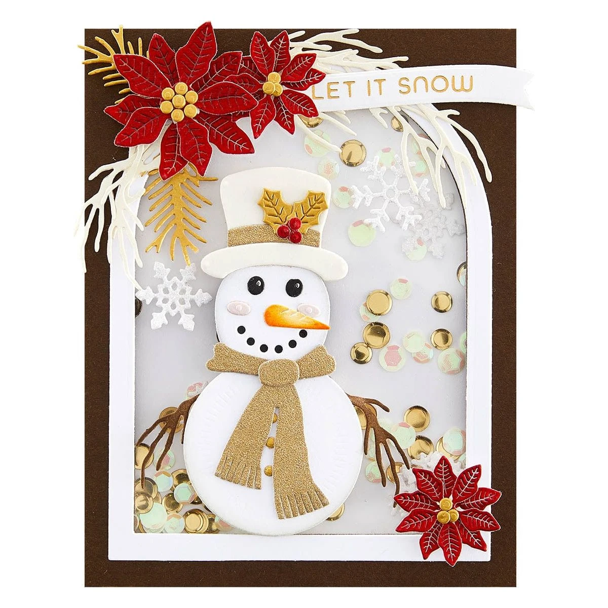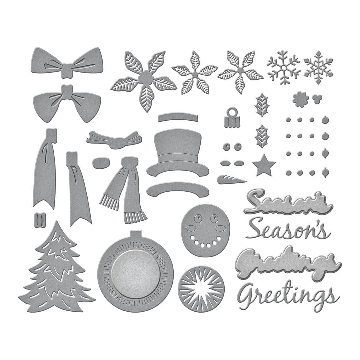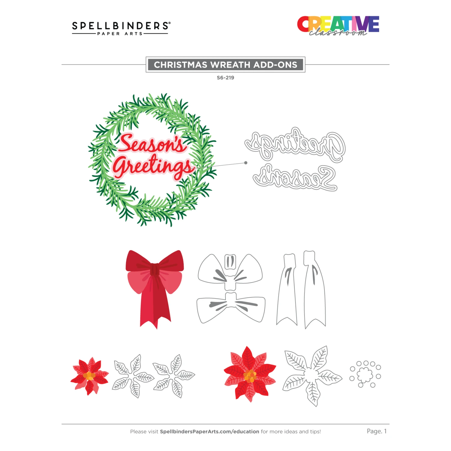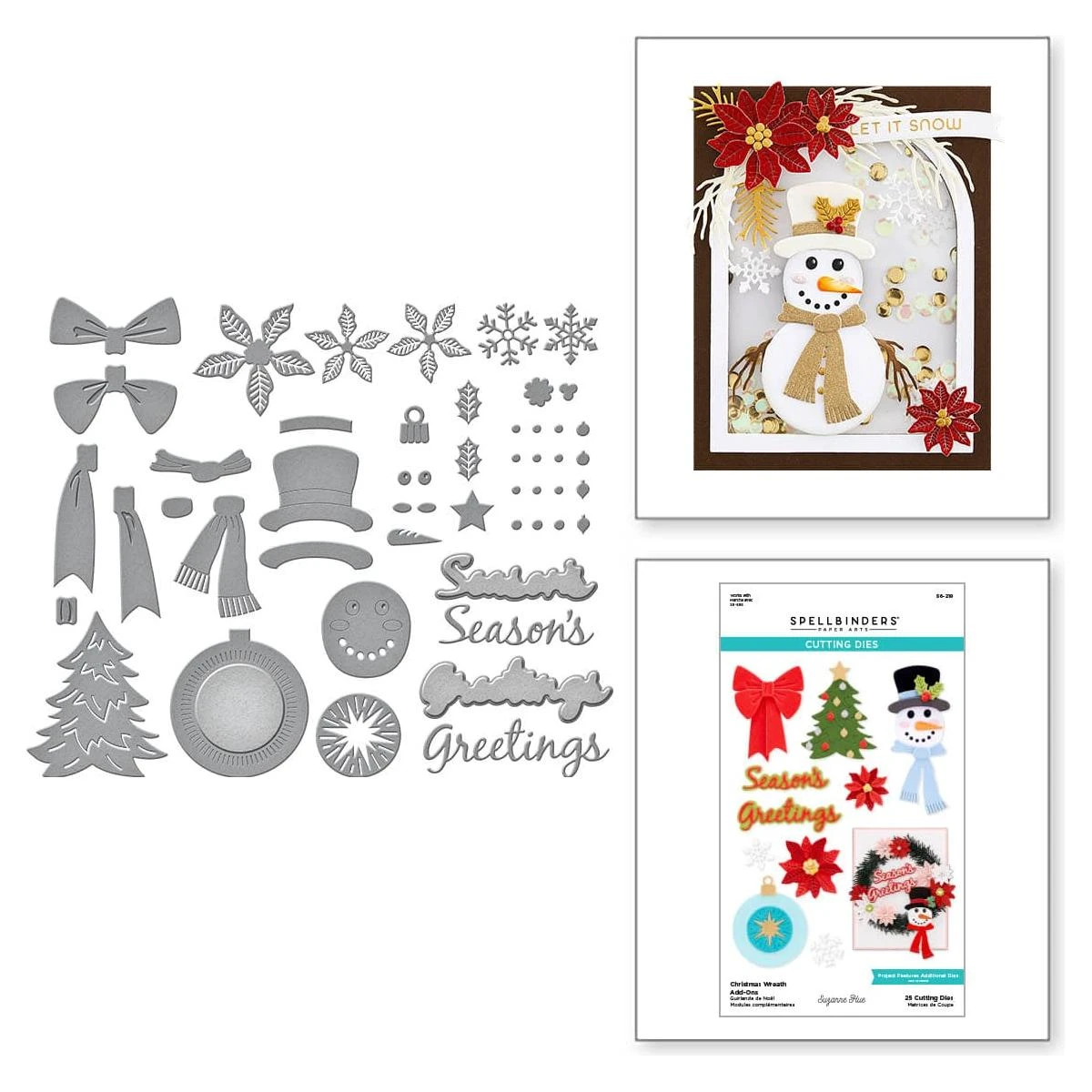 Christmas Wreath Add-Ons Etched Dies are from the Beautiful Wreaths Collection by Suzanne Hue. This set of 25 thin metal cutting dies includes snowflakes, poinsettias, ornament, bow, Christmas tree and more! Designed to work with S5-595 Build-A-Wreath Etched Dies, it will dress up the wreath ready for the holiday season. The set can also stand alone to create wonderful seasonal cards and scrapbook pages.
