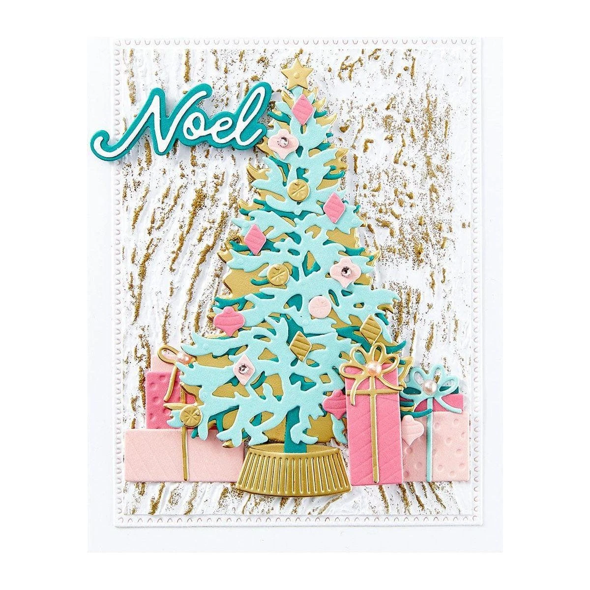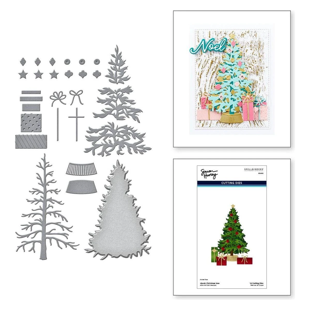 Classic Christmas Tree Etched Dies are from the Timeless Trees Collection by Simon Hurley. Cut and assembled, this set of 14 thin metal cutting dies creates a beautiful traditional Christmas tree with all the trimmings and a pile of gifts around its foot. Not one detail is missed, from the ornament shapes, the star topper, all the way to the bows on the gifts. Use different tones of green cardstock in the tree layers for more dimension and interest.