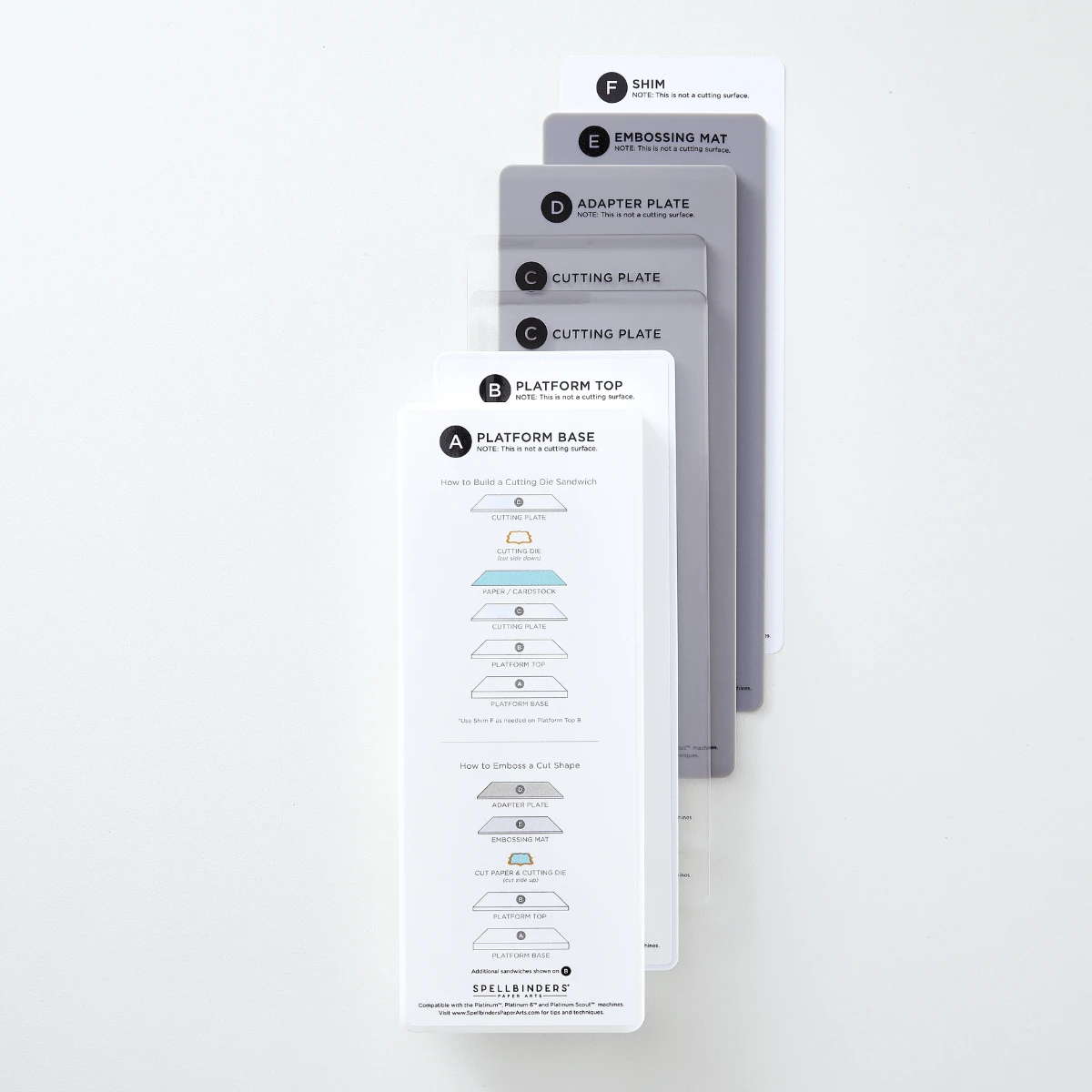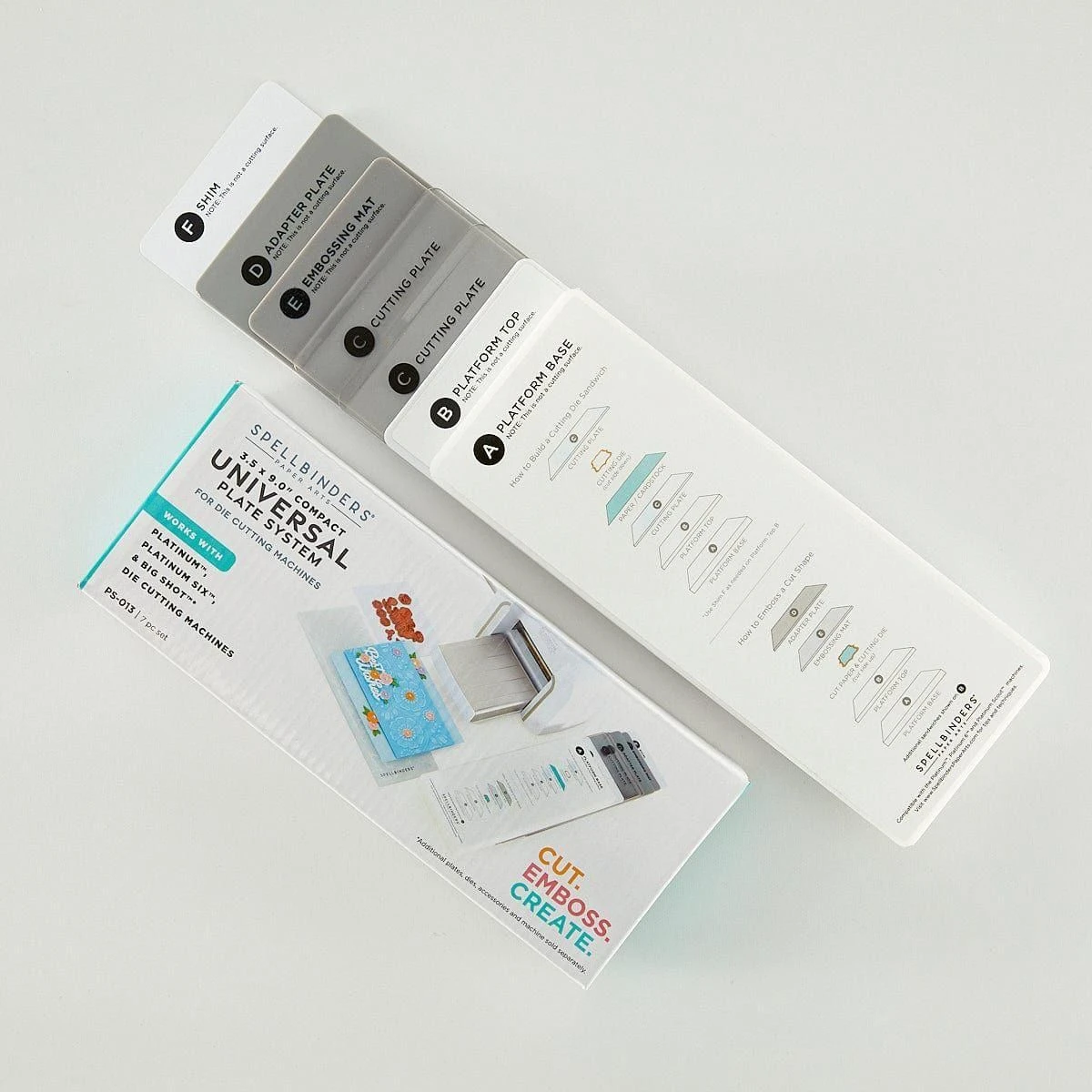 The Compact Universal Plate System works in most die-cutting machines that have a platform larger than 3.5 inches. It accommodates most slimline dies and embossing folders, including slimline 3D Embossing folders. With the widest platform on the market for compact die cutting machines, The Platinum Scout and the Compact Universal Plate System fits plenty of dies from the Spellbinders library, as well as from many other manufacturers.