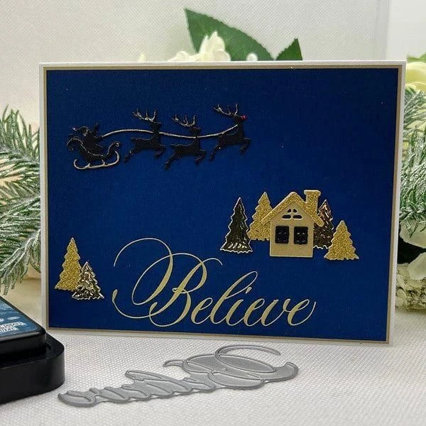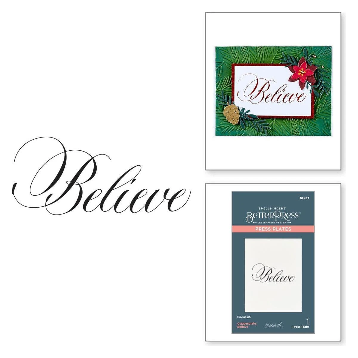 Copperplate Believe Press Plate is from the Copperplate Holiday Sentiments Collection by Paul Antonio. This plate presses the word, Believe, in an elegant Copperplate script onto your card creation. Ink the plates with the BetterPress Ink to be pressed against the BetterPress Cotton Card Panel and Sheets for a crisp letterpress design.