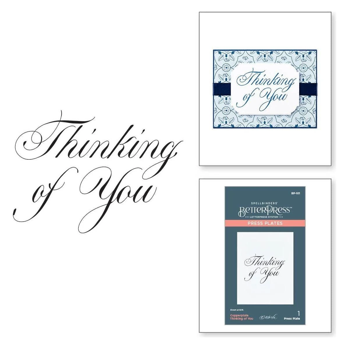 Copperplate Thinking of You Press Plate is part of the Copperplate Everyday Sentiments Collection by Paul Antonio. This plate presses a beautiful Copperplate script with the words ‘Thinking of You.’ Ink the plates with the BetterPress Ink to be pressed against the BetterPress Cotton Card Panel and Sheets for a crisp letterpress design.