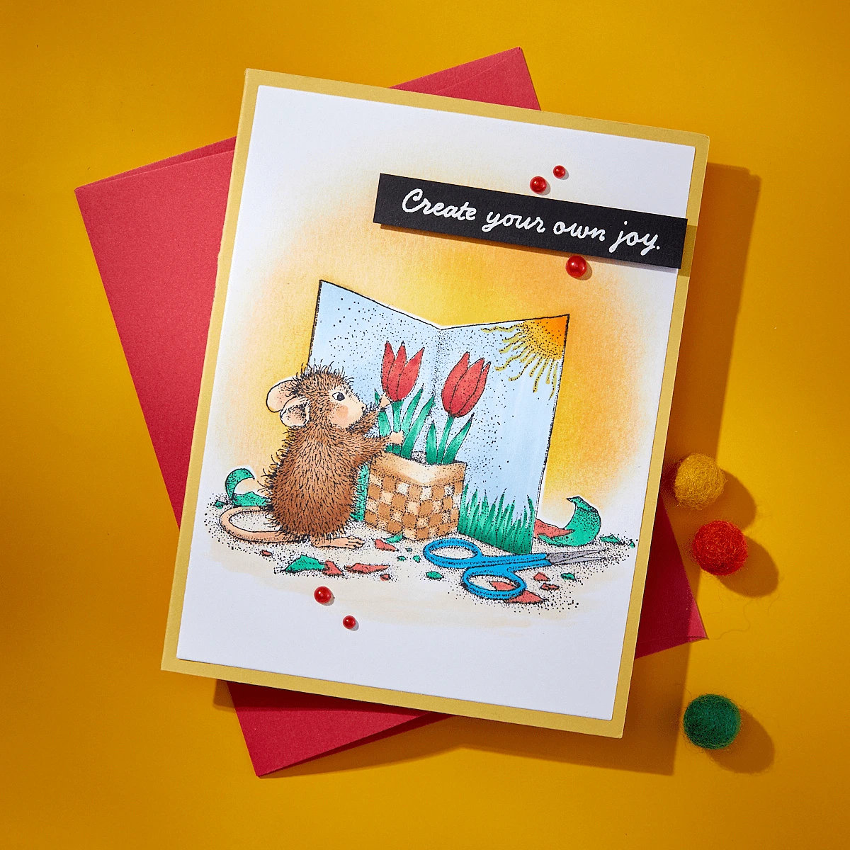 Creative Day Cling Rubber Stamp Set is part of the House-Mouse Creative Day Collection. Muzzy is creating a pop-up card to send to someone special! In addition to the focal image, the set of four stamps includes three sentiments: Have a fun and creative day!; Create your own joy; and Just wanted to say Hello. Designed to be used with an acrylic block. This adorable series of the House-Mouse Designs® is created and copyrighted by the talented Ellen Jareckie. Continuing this wonderful collaboration between Spellbinders and House-Mouse with a creative flair in mind!