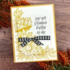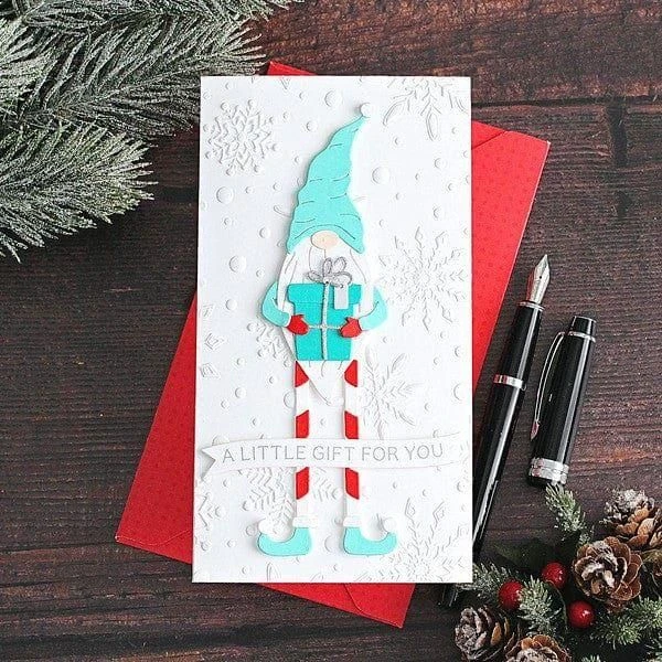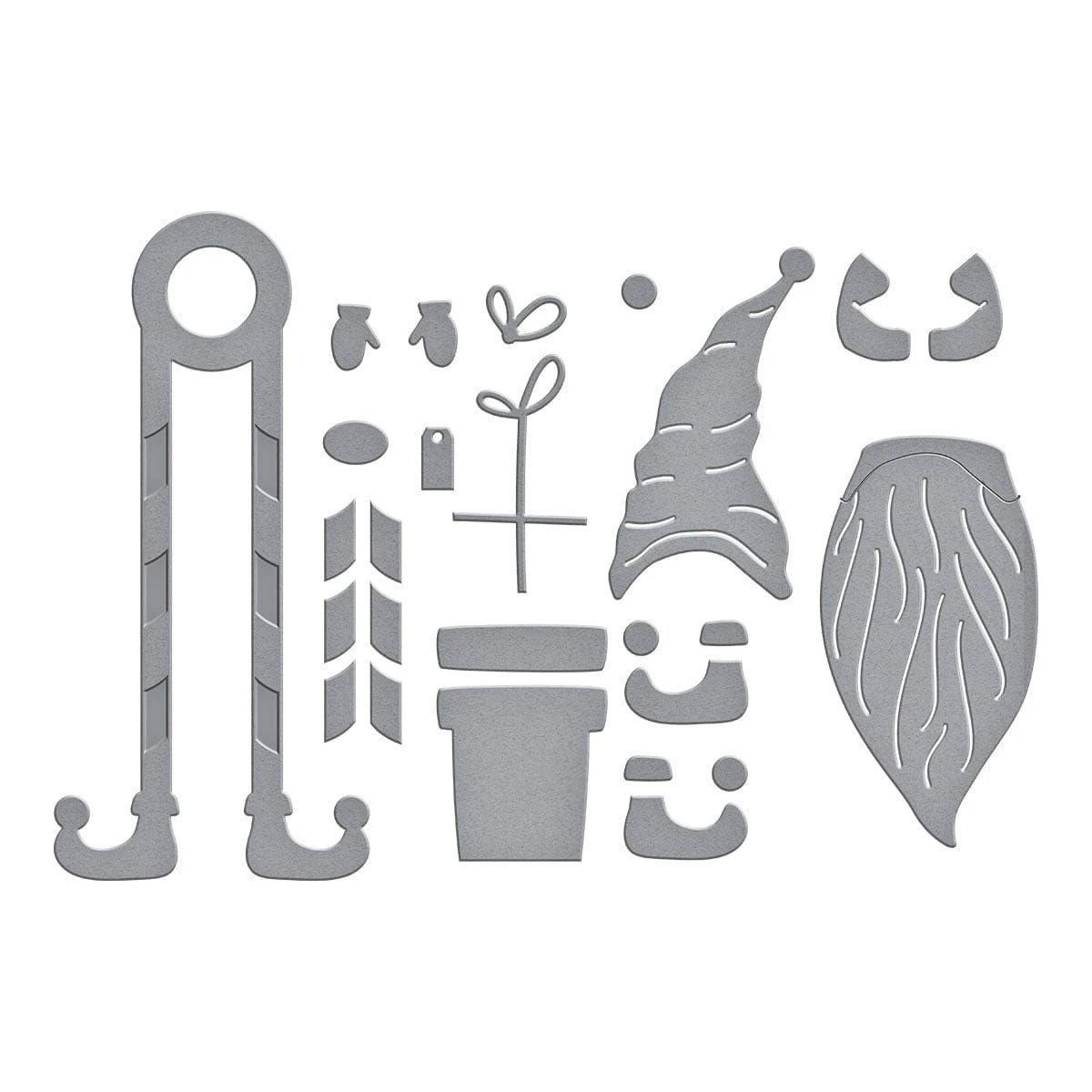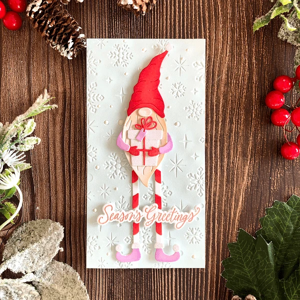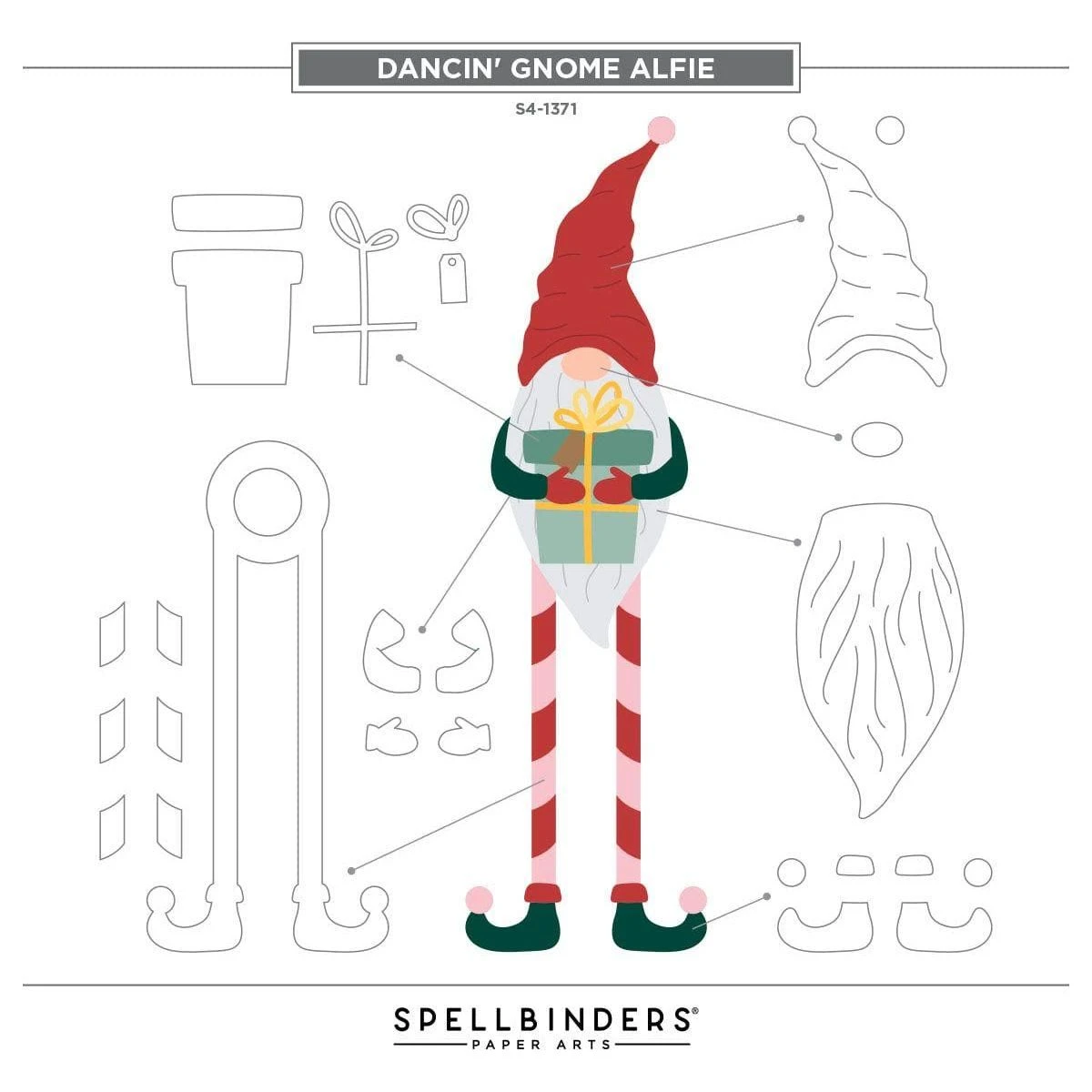 Dancin’ Gnome Alfie Etched Dies is from the Dancin’ Christmas Friends Collection with a set of 10 thin metal cutting dies. When assembled, it creates a super fun gnome with moving legs that swing back and forth. He is one tall gnome measuring almost 6 inches tall! There are other fun accessories in the set to give him the perfect look!