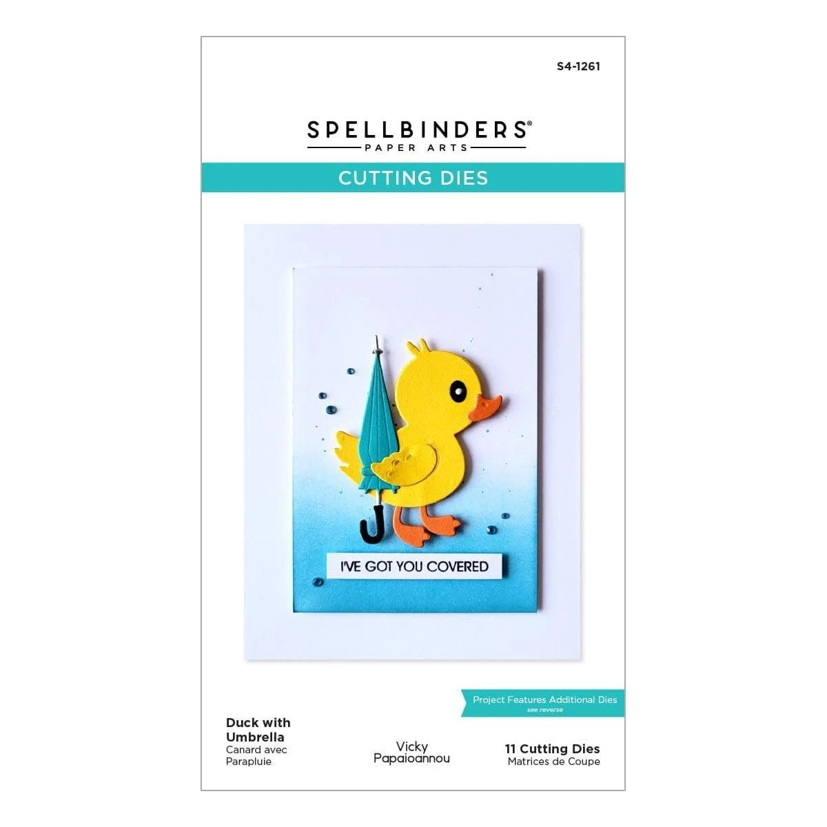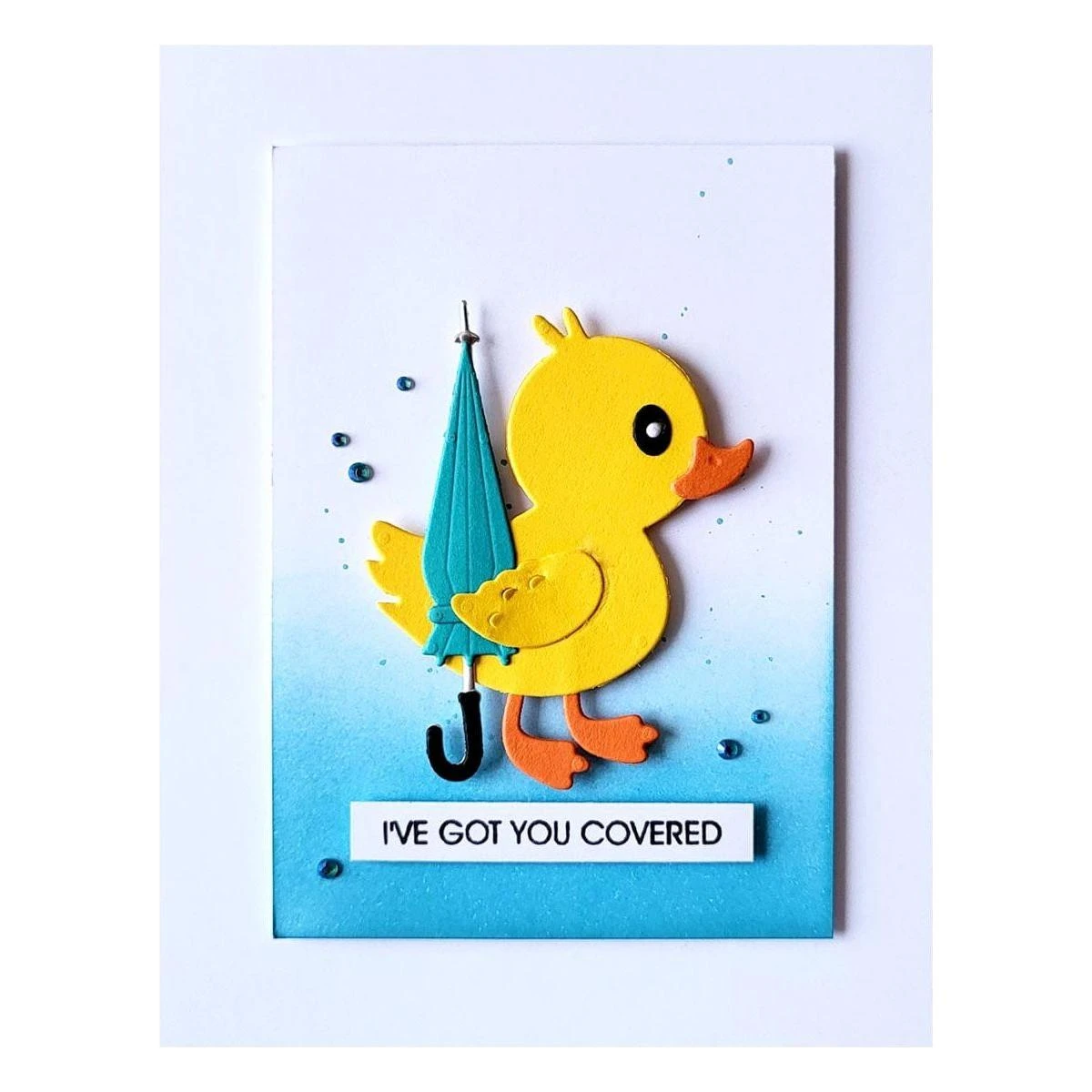 Duck with Umbrella Etched Dies are part of the Showered with Love Collection by Vicky Papaioannou. This set of 11 thin metal dies makes an adorable duck can be dressed up with a bow tie to wearing a rain slicker with a hat. It even has boots and an umbrella. How cute! Who doesn’t love a duck!