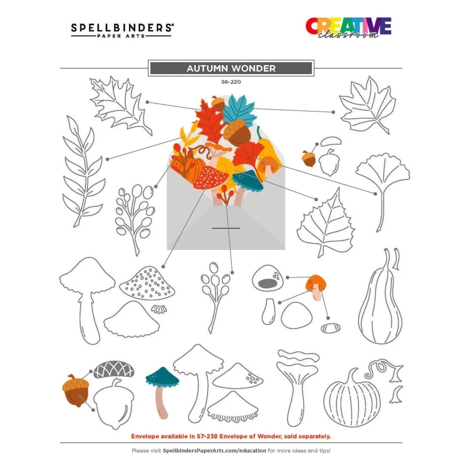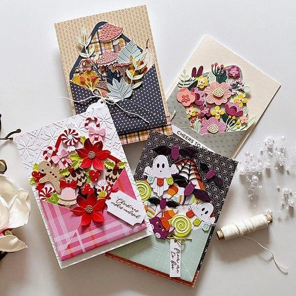 Envelope of Wonder Dies Bundle includes all of the dies in the Envelope of Wonder Collection. With this bundle, you’ll have everything you need to make adorable blooming envelopes for every season. This bundle includes four die sets, S5-603 Halloween Wonder Etched Dies, S5-604 Christmas Wonder Etched Dies, S6-220 Autumn Wonder Etched Dies, and S7-238 Envelope of Wonder Etched Dies.