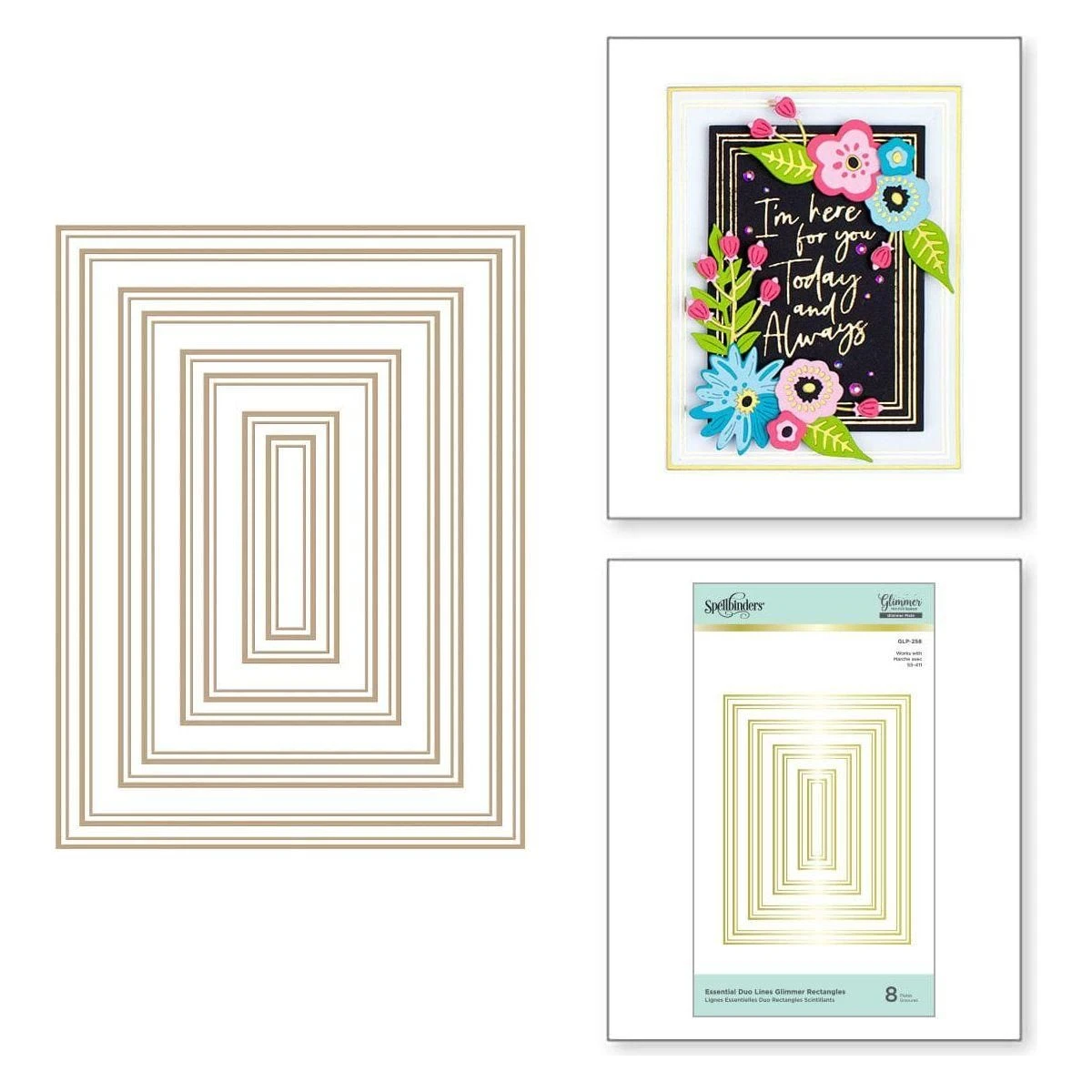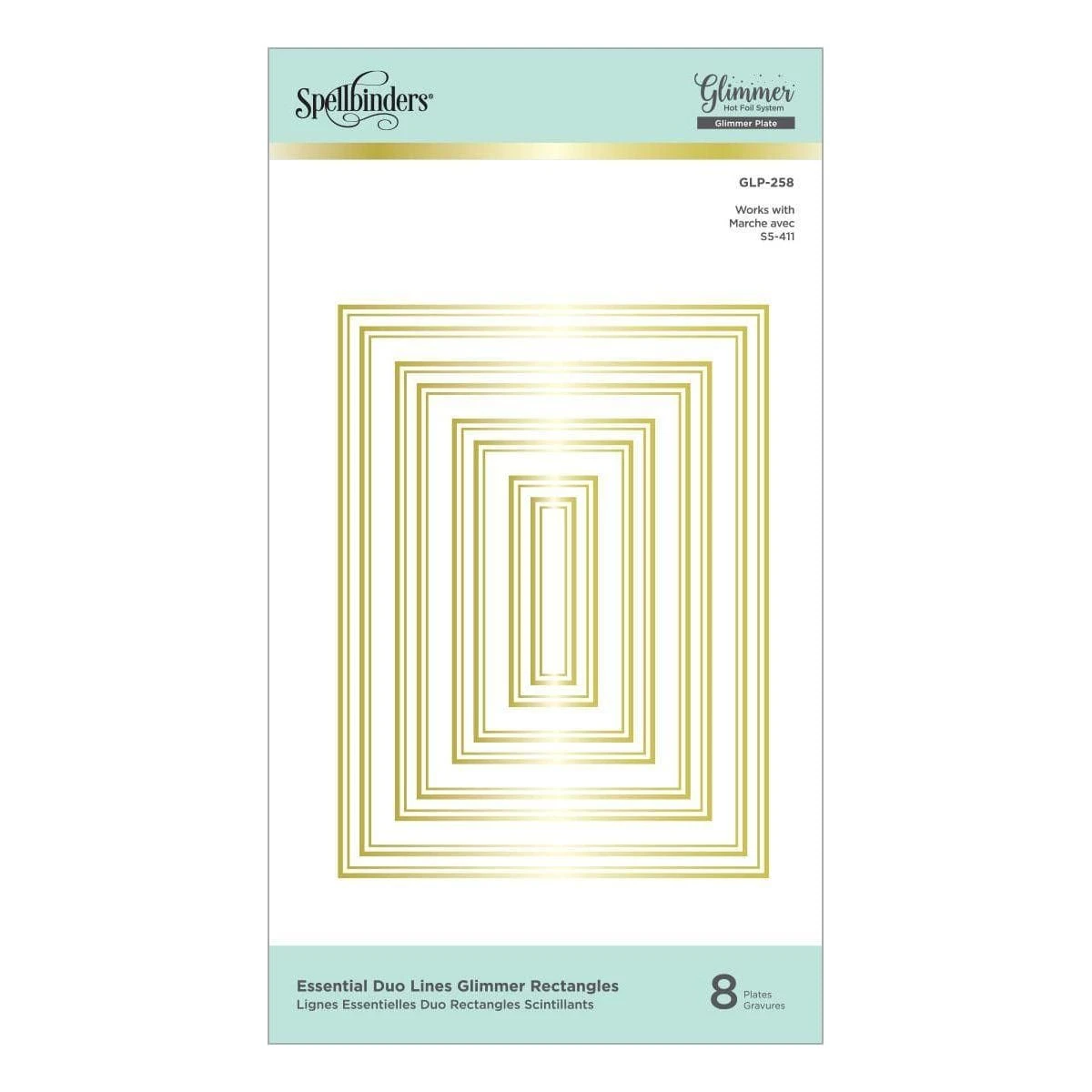 Essential Duo Lines Glimmer Rectangles Glimmer Hot Foil Plates is a set of eight plates with double lines framing the rectangle design in graduating sizes. Nested with S5-411 Essential Rectangles Etched Dies set, the foil accent is perfectly placed between the inlay pattern and rectangle edge for a wonderful effect.