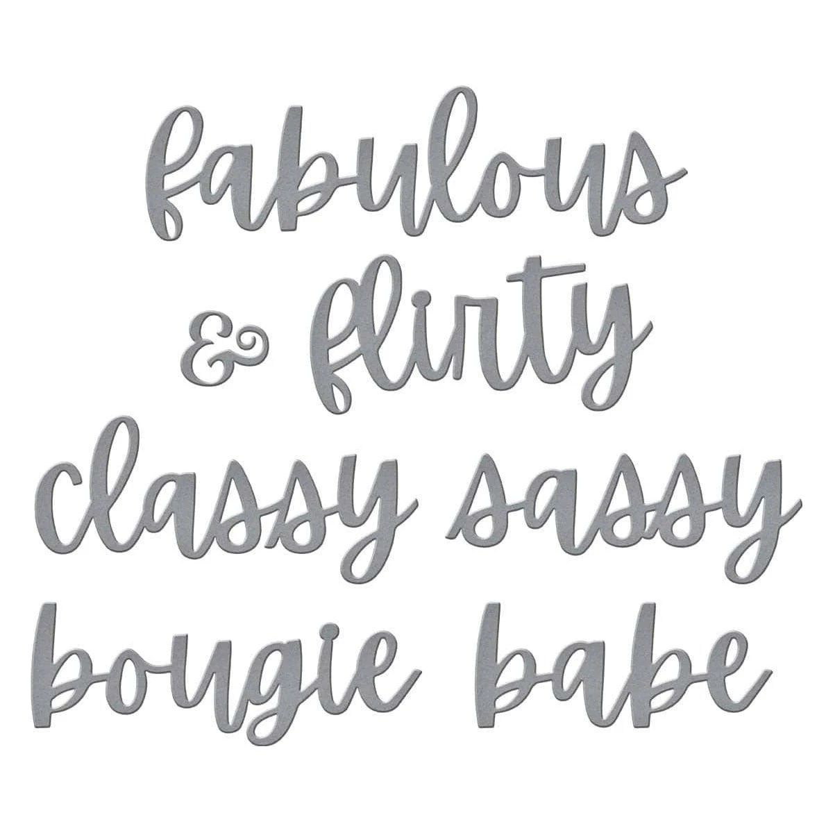 Fabulous Birthday Etched Dies are part of the Bougie Birthday Collection by Nina Boettcher. Personalize your projects with these words and ampersand (&) into greetings! Or add them to the birthday cake shape created from the S5-676 Ganache Gateau set as a cake topper. Included in this set of seven thin metal cutting dies set are Sassy, Babe, Bougie, Classy, Flirty, Fabulous and the ampersand.