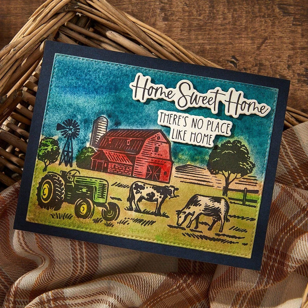 Farm Sweet Farm Registration BetterPress Plate & Die Set is part of the Justine’s Farm Collection by Justine Dvorak. Create a peaceful farmhouse scene with this set of fourteen press plates, a clear acetate registration template for perfect placement and four thin metal cutting dies to cute out the sentiment. Let the registration mylar sheet guide you in making this scene come to life in color. Finish off with a choice of four sentiments that can be cut with the matching dies: Home Sweet Home, Farm Sweet Farm, Live Like Someone Left the Gate Open, and There’s no Place like Home.