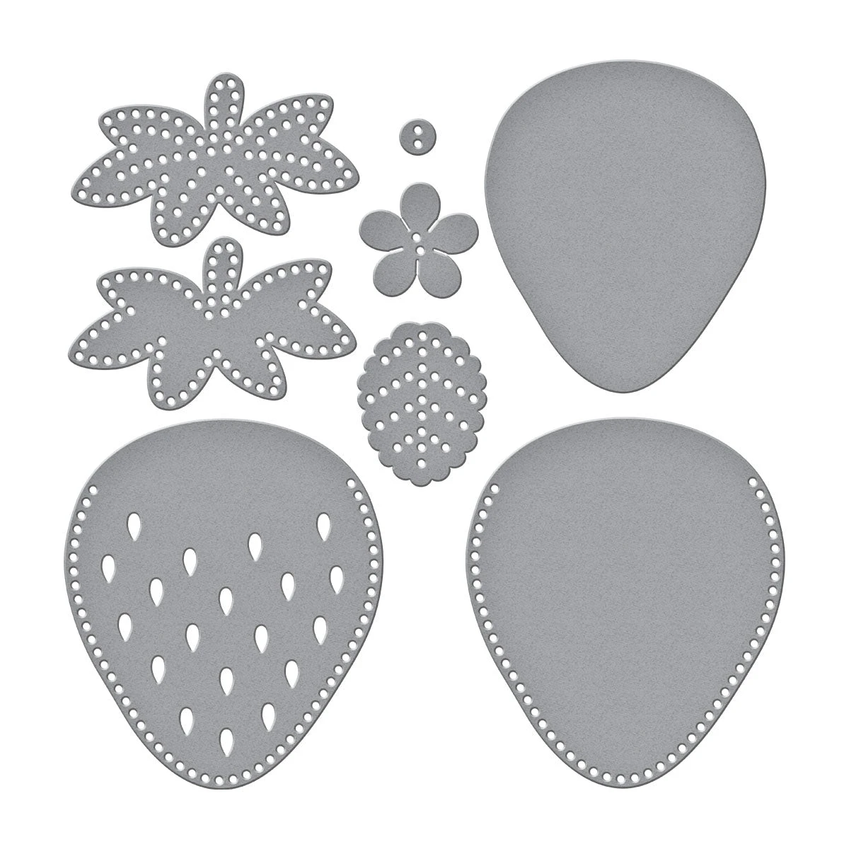 Felt Berry Blossom Etched Dies are part of the Summer Felt Stitch & Create Collection by Nichol Spohr. Make this sweet strawberry with its leaf and flower accents using this set of eight thin metal cutting dies. The detailed stitching on the shapes’ edges gives it a finished look and becomes a stitching guide. Cut with our Merino Wool Felt Sheets for texture or cut in paper for a different look. The finished Strawberry measures approximately 2.72 x 3.68 in./6.90 x 9.40 cm, the Flower measures 1.02 x 0.99 in./2.60 x 2.50 cm, and the Leaf measures 1.11 x 1.41 in./2.80 x 3.60 cm.