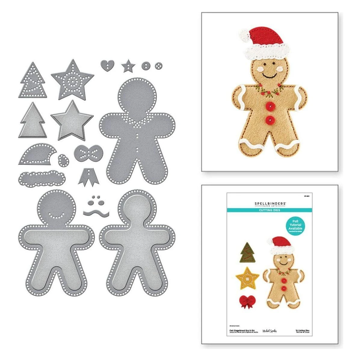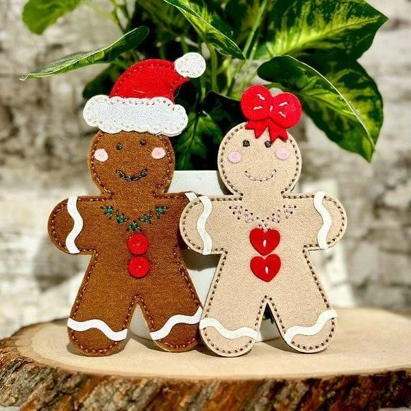 Felt Gingerbread Boy & Girl Etched Dies are from the Felt Stitch & Create Collection by Nichol Spohr. When assembled, this set of 19 thin metal cutting dies creates a gingerbread person with all kinds of wonderful details. It includes accessories to give it more character like as a Santa Hat, holiday tree, a layered bow tie and a detailed star. The detailed stitching design on the shapes edges gives a wonderful, finished look and creates a guide for stitching these gingerbread boy and girl together. Cut with our Merino Wool Felt Sheets sets to bring it to life in texture and dimension, or cut in paper for an entirely different look.