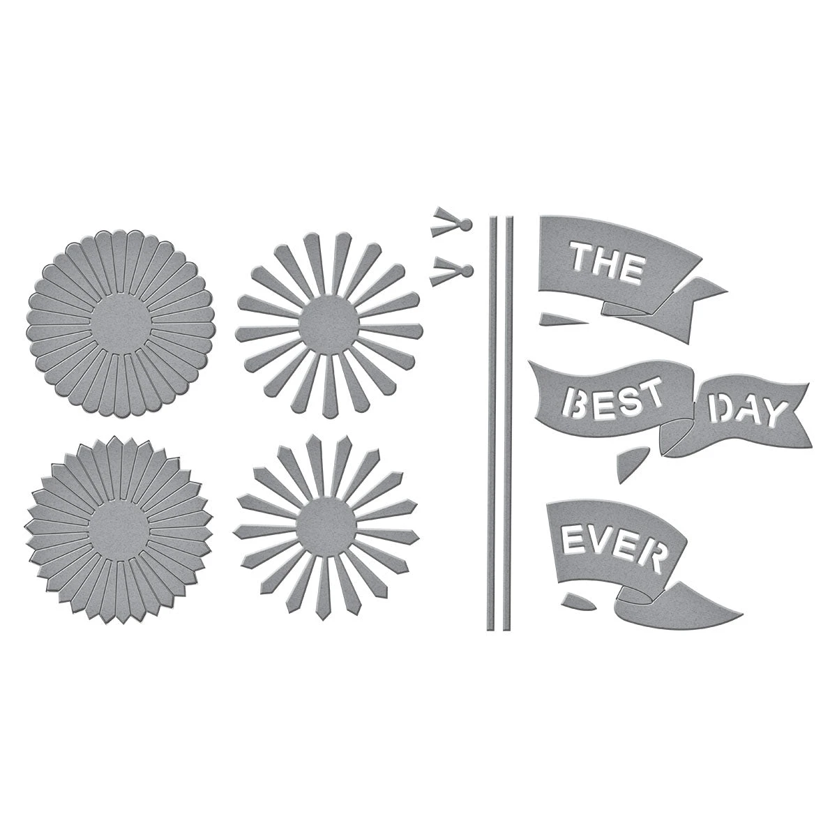 Classic Mouse Flags & Banners Etched Dies is from the Say Cheese Classic Mouse Collection and comes with 13 dies to create gorgeous layered rosettes and curling flags that read ‘The Best Day Ever’. The rosettes are designed to perfectly fit the letters and numbers from S5-703 Alphabet, S4-1469 Numbers & Punctuation to make richly layered titles for your scrapbook pages or cards. Channel classic fun and vintage charm with this set, perfect for using with the rest of dies in the collection… or other elements from your stash!