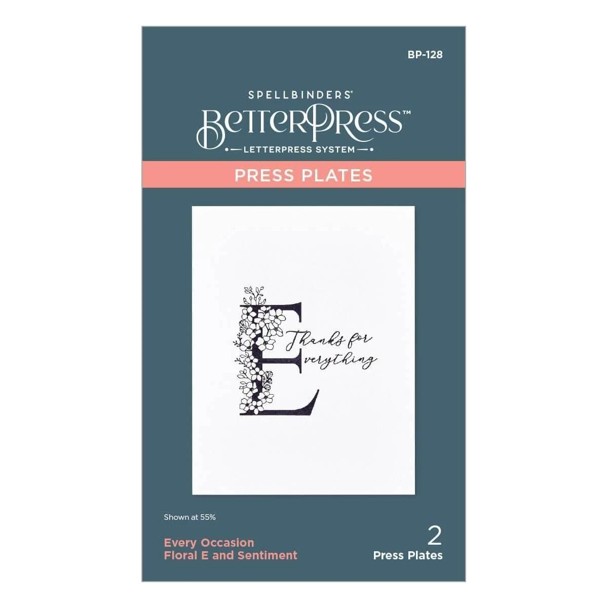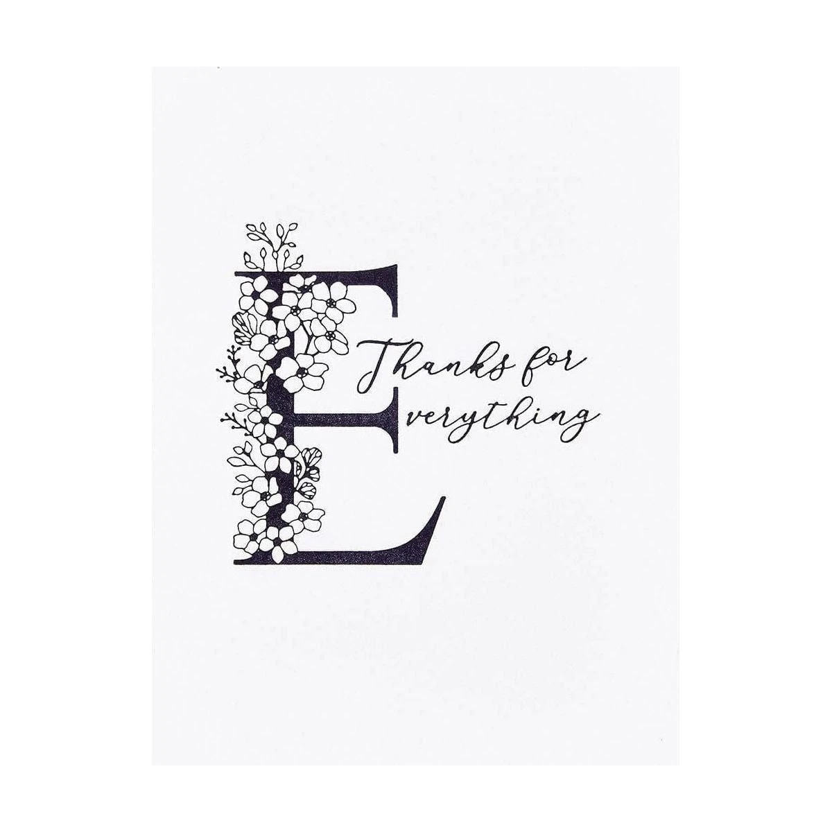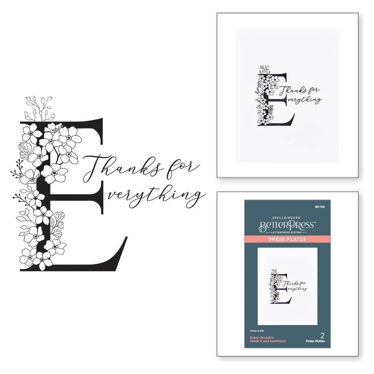 Floral E and Sentiment Press Plate is part of the Every Occasion Floral Alphabet Collection and includes two press plates. The largest plate is a stunning contemporary uppercase E font accented with floral details. The second plate compliments the letter with a sentiment, Thanks for (E)verything. Ink the plates with the BetterPress Ink to be pressed against the BetterPress Cotton Card Panel and Sheets for a crisp letterpress design.