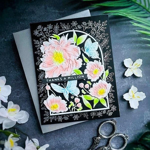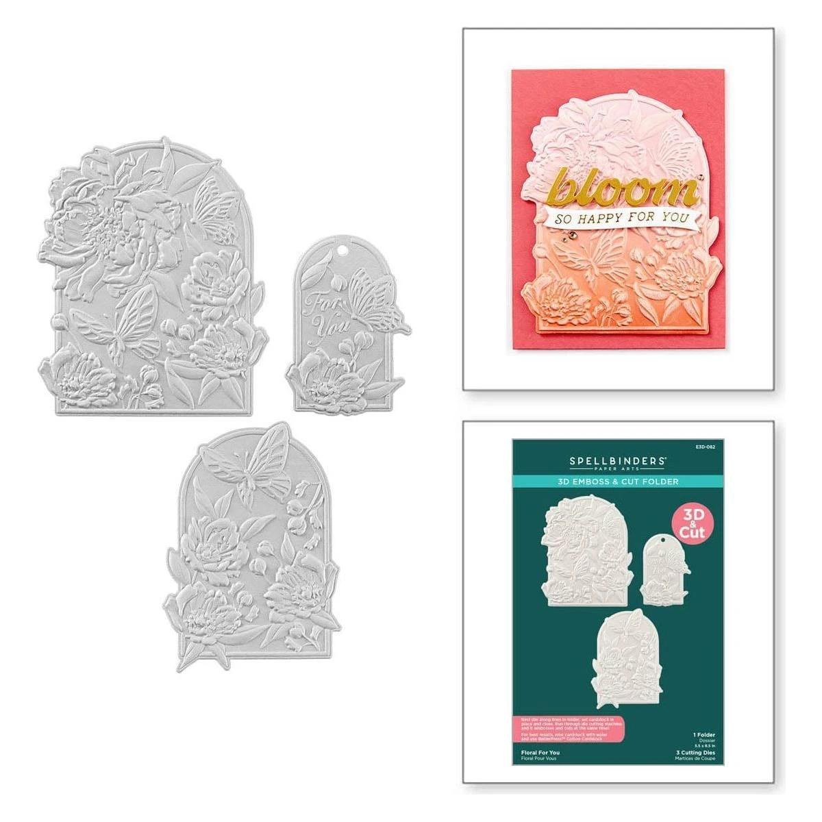 Floral For You 3D Emboss & Cut Folder is a 5.50 x 8.50 in. embossing folder with three thin metal cutting dies. This set creates three sweet floral arch shaped vignettes with one of them being a tag to be used for projects or gifts.