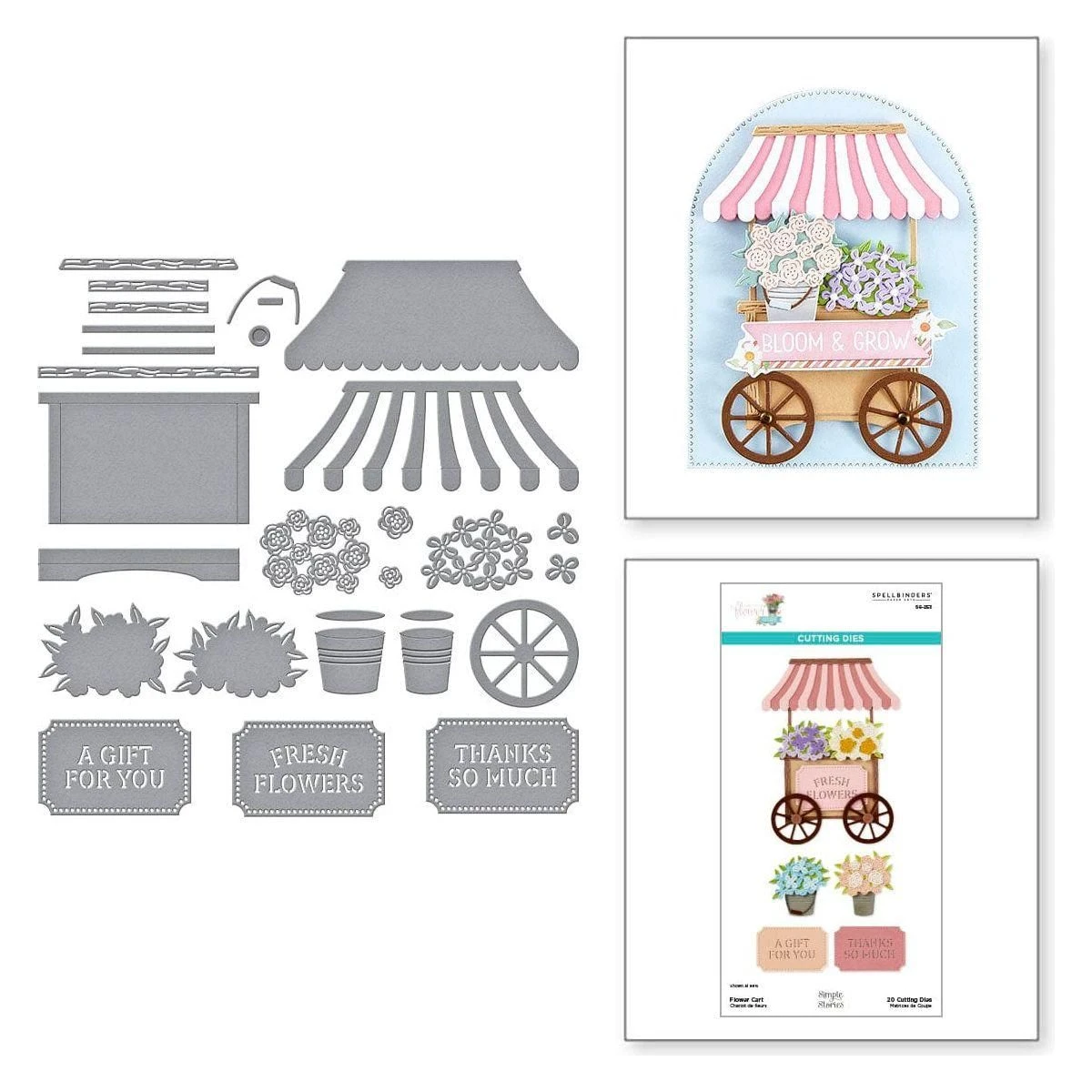 Flower Cart Etched Dies are part of the Simple Vintage Flower Shoppe Collection designed in collaboration with Simple Stories. Don’t be fooled by the impressiveness of this beautiful die set- it’s deceptively easy to put together! This charming striped cart and its bunches of flowers layer up perfectly for a complex look created with just a few pieces. When assembled, this set of 20 thin metal cutting dies creates a stunning and detailed roofed flower cart complete with bouquets, flower buckets and more! Also included are three sentiments: Fresh Flowers, A Gift for You, and Thanks So Much that can be placed on the cart’s front panel. The finished flower cart measures approximately 3.65 x 4.90 in./9.30 x 12.40 cm and the flower bucket measures 1.40 x 1.65 in./3.50 x 4.10 cm.
