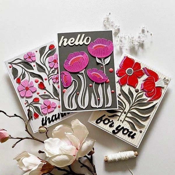 Fresh Picked Die Bundle is part of the Fresh Picked Collection and includes all five etched die sets from this collection. S4-1329 Fresh Picked Sentiments Etched Dies, S5-617 Fresh Picked Daffodils Etched Dies, S6-226 Fresh Picked Buttercups Etched Dies, S6-227 Fresh Picked Berries Etched Dies and S6-228 Fresh Picked Anemones Etched Dies. Mix and match bloom designs to create a hip and colorful garden. Pair them with a contemporary background like SES-056 Columns Embossing Folder (sold separately) for texture and interest.