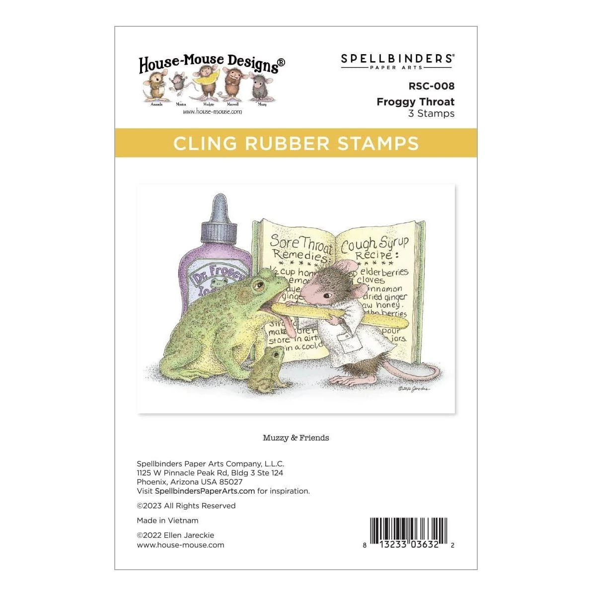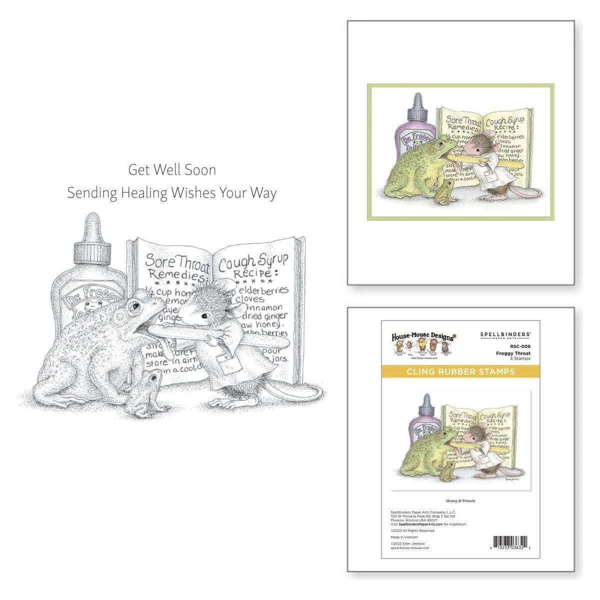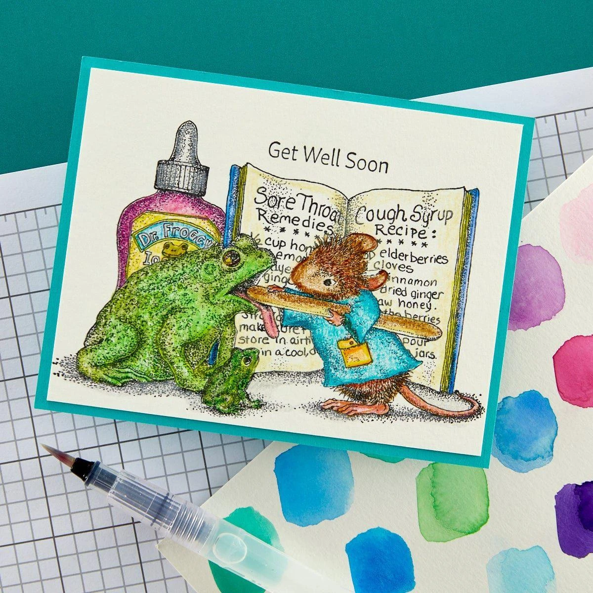 Froggy Throat Cling Rubber Stamp Set is from the House-Mouse Designs Everyday Collection with a set of three stamps. Say AH and heal fast by this cute Dr. Muzzy! Along with the doctor’s office scene, use one of the two healing greetings too. Designed to be used with an acrylic block.