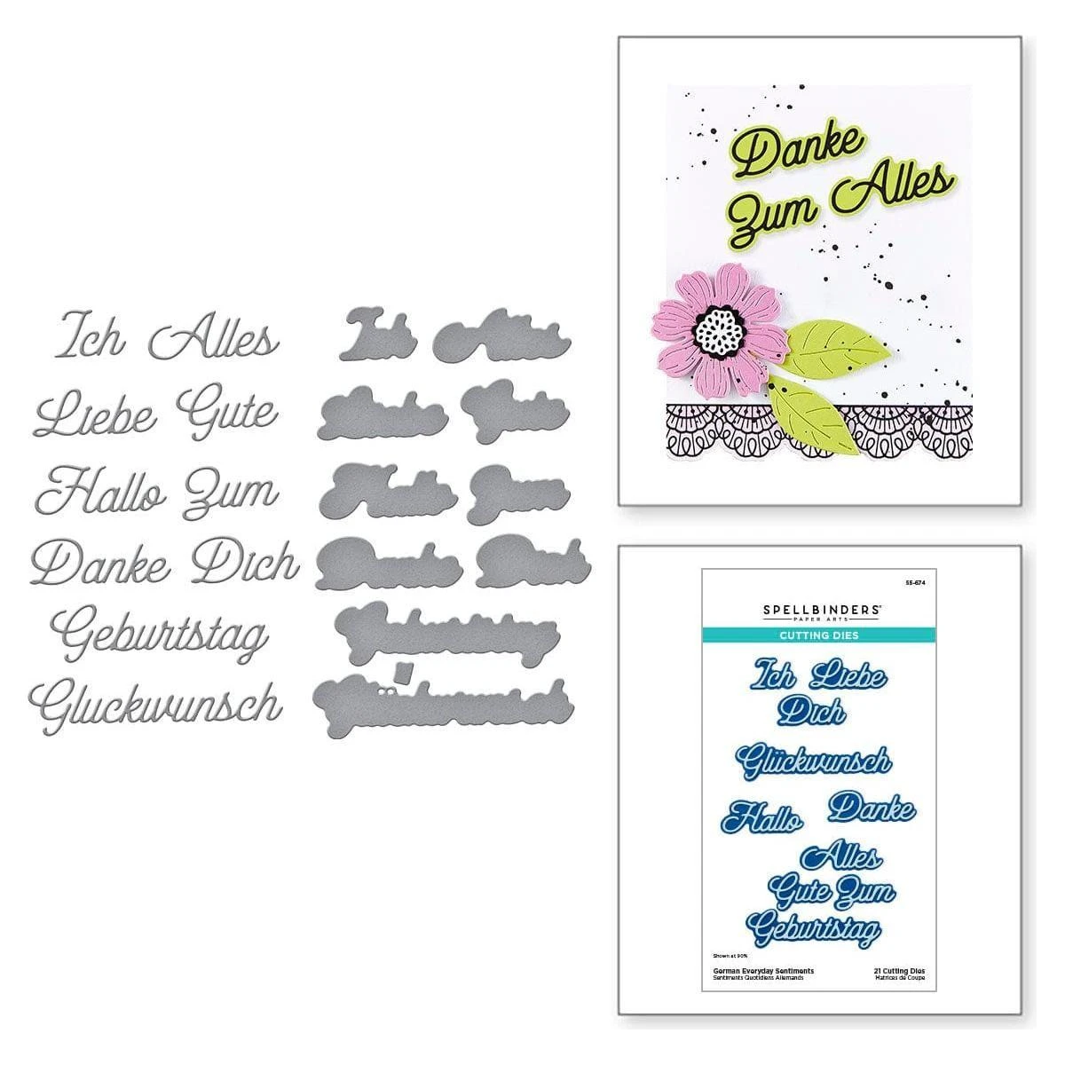 German Everyday Sentiments Etched Dies are part of the International Sentiments Collection. Many German phrases can be created in this set of 21 thin metal cutting dies. The fancy script font can be used in a narrow font or make it bolder by adding its matching shadow die. To expand your sentiment even more, try BP-266 German Sentiments Press Plate & Die Set to letterpress or foil for an impressive impression! Words include Ich/I, Alles/Everything, Liebe/Love, Hallo/Hello, Gute/Good, Danke/Thanks, Zum/For the, Dich/You, Geburtstag/Birthday, and Gluckwunsch/Congratulations.