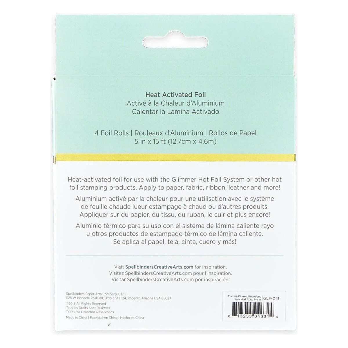 Glimmer Hot Foil 4 Rolls – Spellbound Variety Pack comes in four different colors. Each roll is 15-foot with a width of 5-inches. Colors include: Fuchsia Flower, Moondust, Speckled Aura and Prism.