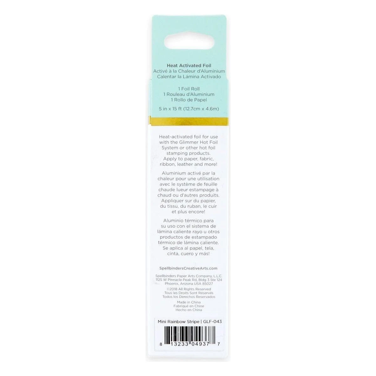 Glimmer Hot Foil Roll Mini Rainbow Stripe comes in a 15-foot roll and a width of five-inches.
