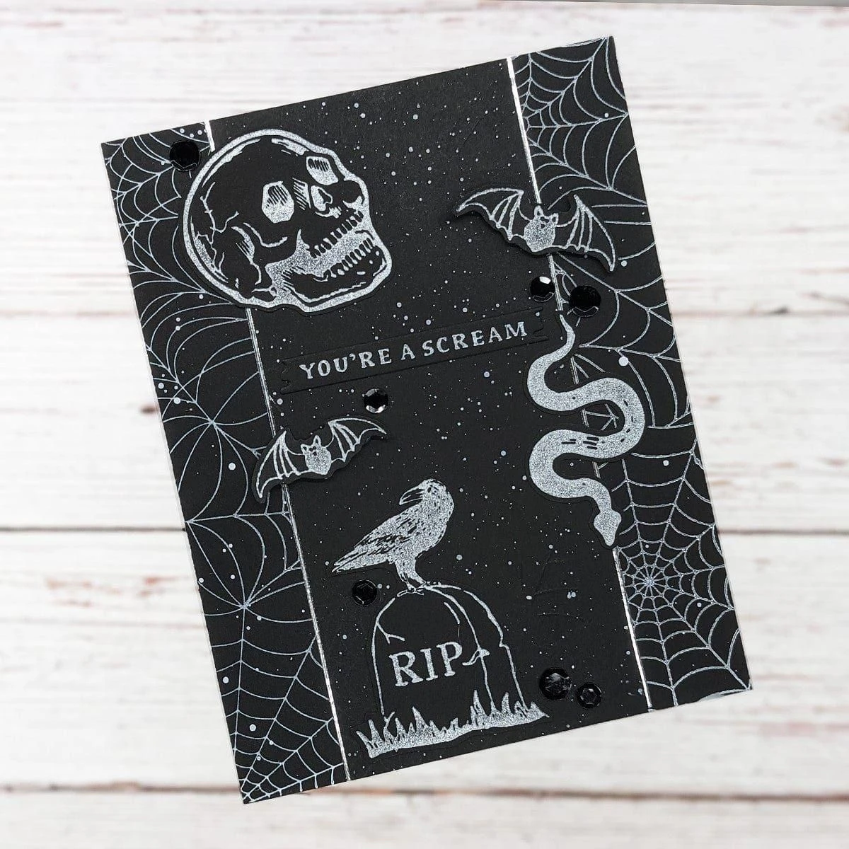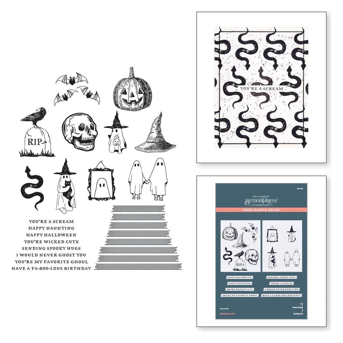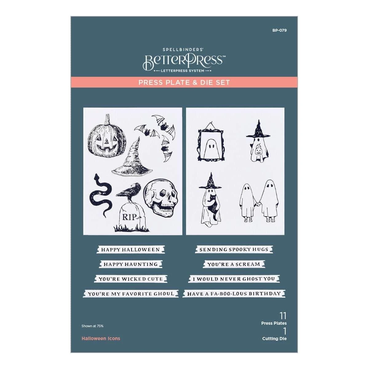 Halloween Icons Press Plate & Die Set is from the BetterPress Halloween Collection with this amazing set of 11 press plates and one thin metal cutting die. It has all the Halloween icons: from pumpkin, ghouls, bats witch hats and more. It even has a stack of eight Halloween-themed sentiments and a thin metal die that will cut the entire stack in one step. Perfect for those Halloween projects! Ink the plates with the BetterPress Ink to be pressed against the BetterPress Cotton Card Panel and Sheets for a crisp letterpress design.