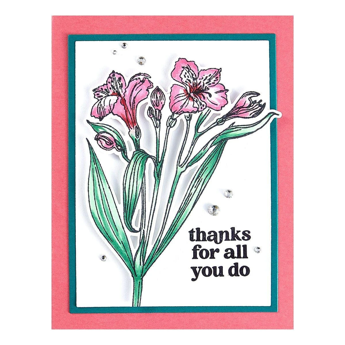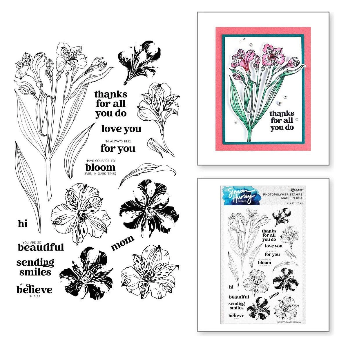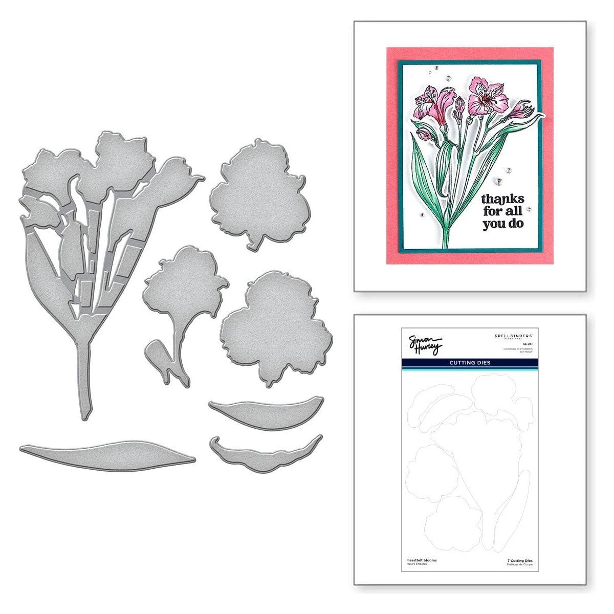 Heartfelt Blooms Stamp & Die Bundle includes S6-251 Heartfelt Blooms Etched Dies and HUR88776 Ranger Heartfelt Blooms Clear Stamp Set. Whether you’re creating a sweet bouqet of full Iris stems or decorating a card with a few individual flowers, the flowers in this set make an ideal arrangement for sharing love. Create dimension by cutting out the blooms with the coordinating dies and popping them up with adhesive foam, or secure the sprig with a twine bow for a charming touch. The Heartfelt Blooms stamp set becomes even more versatile with these dies.