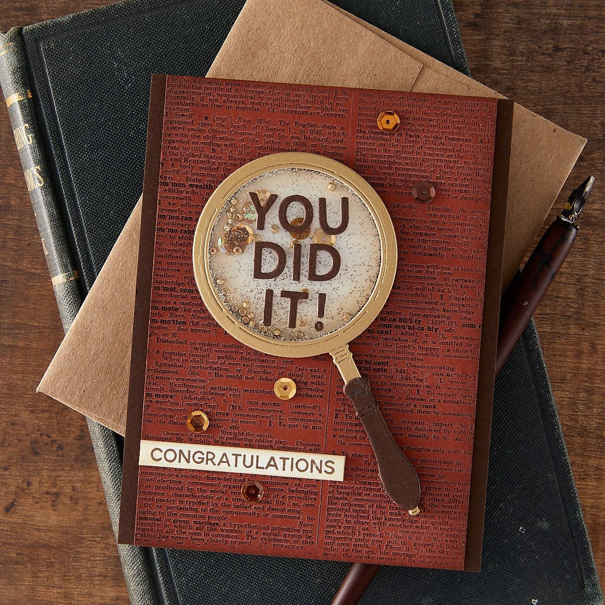 The Magnifying Glass Die Set from the Case Closed Collection is a set of five thin metal dies that come together to create a fun magnifying glass. Perfect for putting extra focus on your message, the set also includes two bold sentiments: ‘You Did It!’ and ‘So Glad I Found You.’ This die pairs well with CM801 It’s No Mystery Stamp Set to add even more playful greetings.