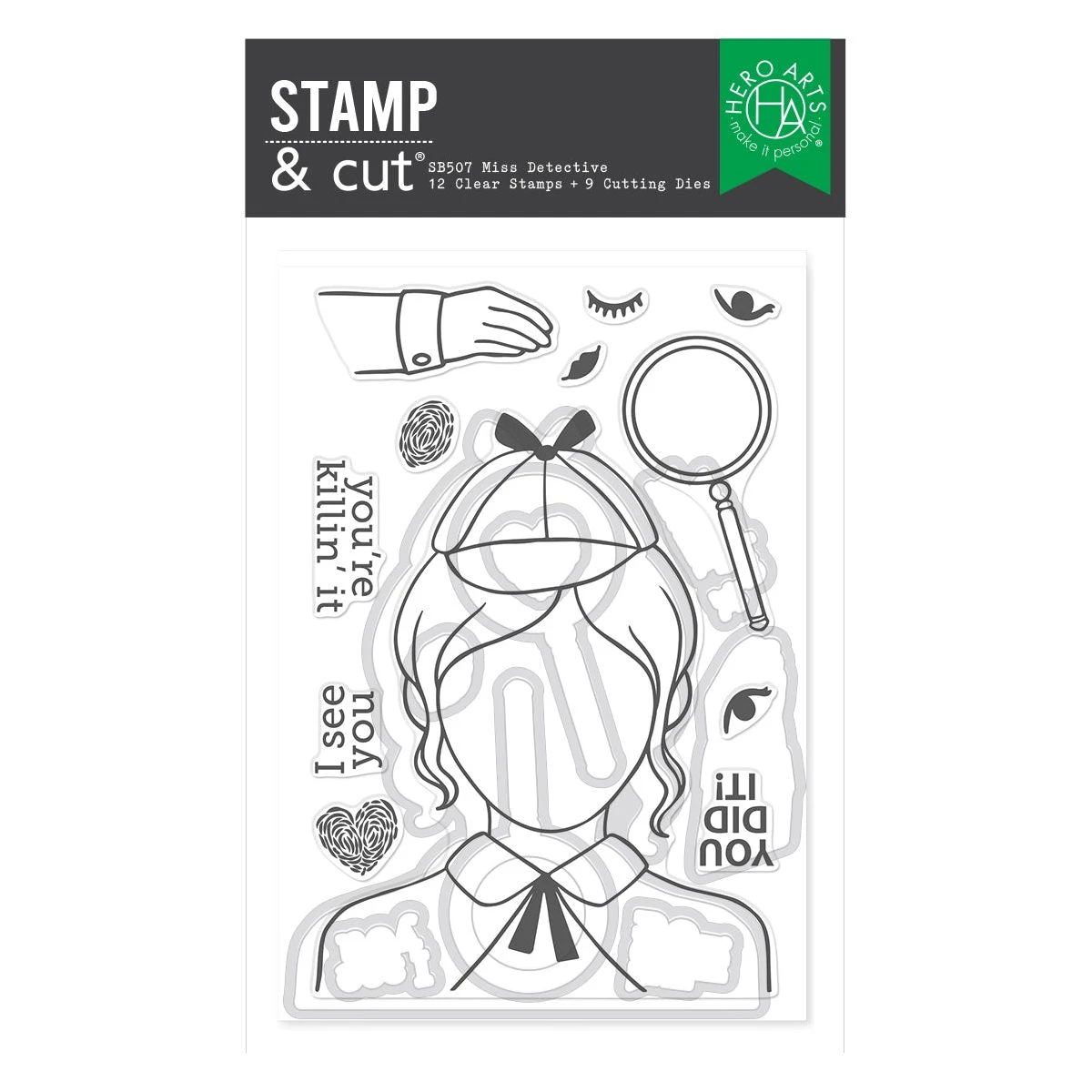 Miss Detective Stamp & Cut Set is from the Case Closed Collection. Cases can’t be closed without a great detective, and this set brings her to life! Featuring a large focal point of a lady detective and her magnifying glasses solves the mystery of how to make the cutest card ever. This set of twelve clear stamps includes three sentiments, ‘you’re killin it’, ‘I see you’ and ‘You did it!’ as well as fingerprints for your crime scene. Use the coordinating dies to cut out the stamped images for extra dimension and creative possibilities! Combine with SA302 Houndstooth Layering Stencils to add the perfect detective flair to her wardrobe.