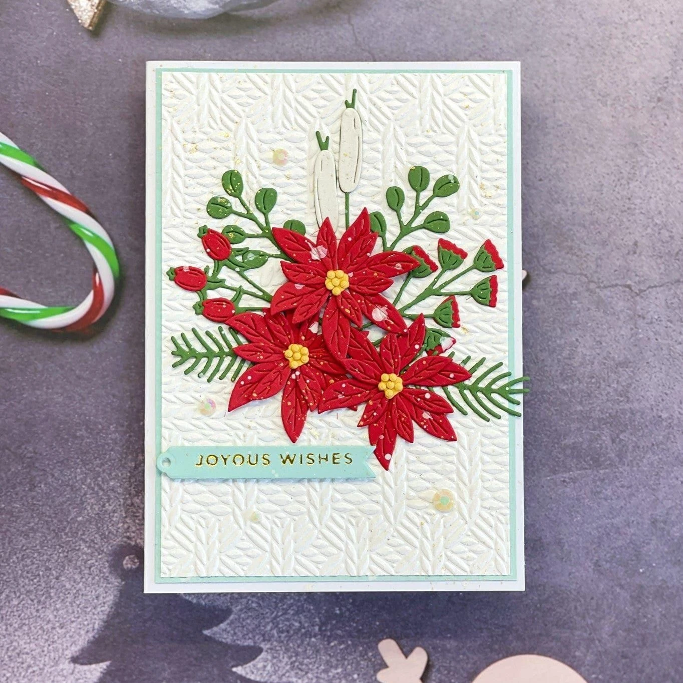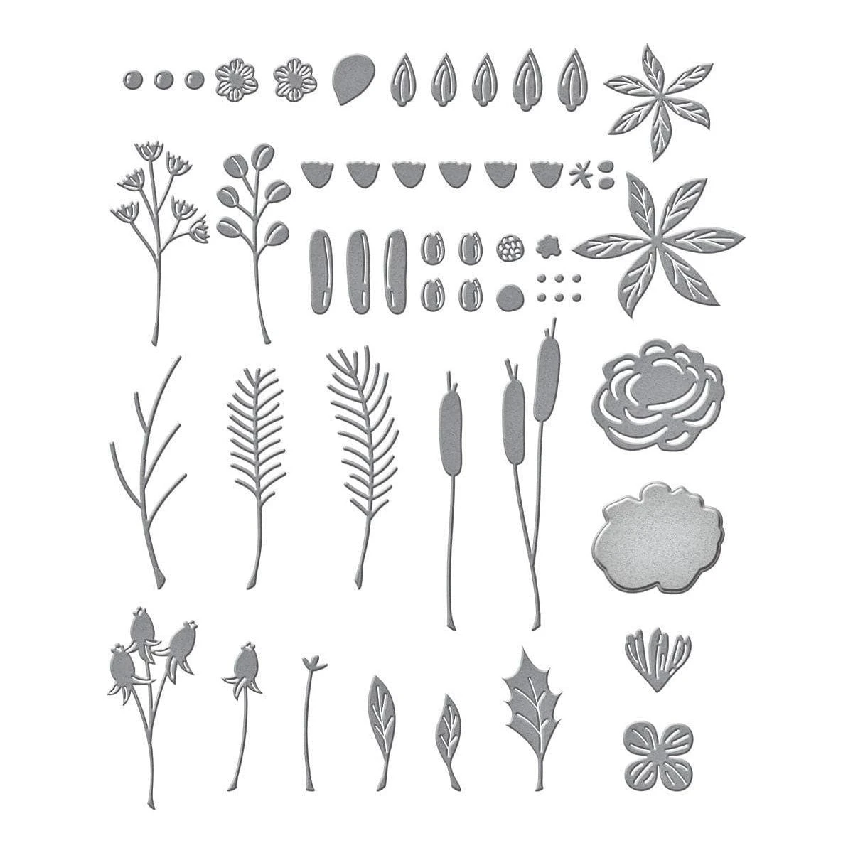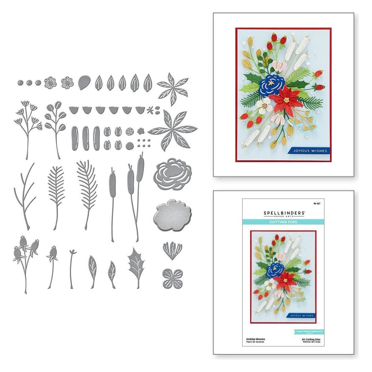 Holiday Blooms Etched Dies is beautiful Christmas florals and part of the Celebrate the Season Collection. This set of 26 thin metal cutting dies can create a sweet single bloom to a full blown out holiday bouquet. Many types of blooms to choose such as a rose, bell-shape flower, Poinsettia, and more. Accents include Cattail, Holly Berry, Evergreen, and much more. How will you create your bouquet?