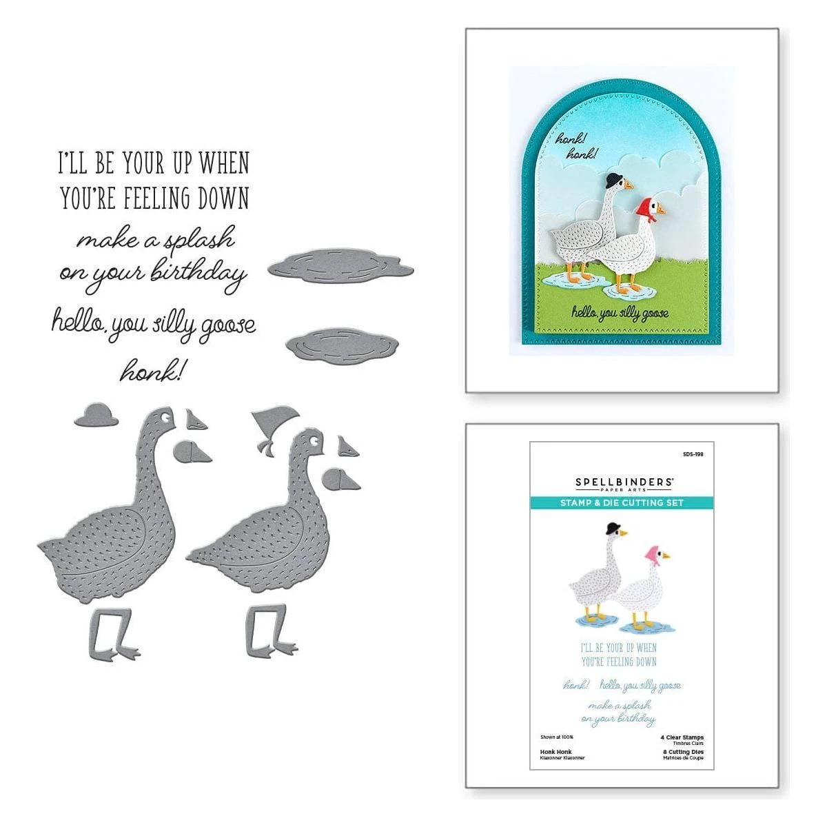 Honk Honk Clear Stamp & Die Set is part of the On the Farm Collection. This lovely set of eight thin metal cutting dies creates two geese with a hat and kerchief, plus two puddle designs. Add in the four punny clear stamp phrases included in this set and cards come together in a flash with the perfect matching sentiment. Stamps include: I’ll Be Your Up When You’re Feeling Down, Make a Splash on Your Birthday, Honk! and Hello, You Silly Goose. Assembled Geese in Puddles measures approximately 2.59 x 2.31 in./6.60 x 5.90 cm.