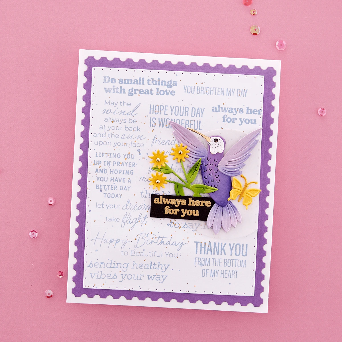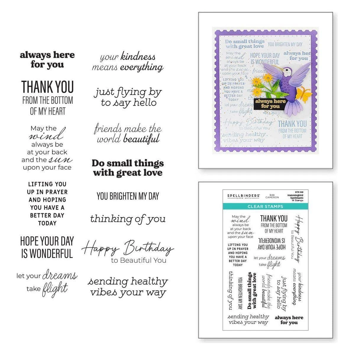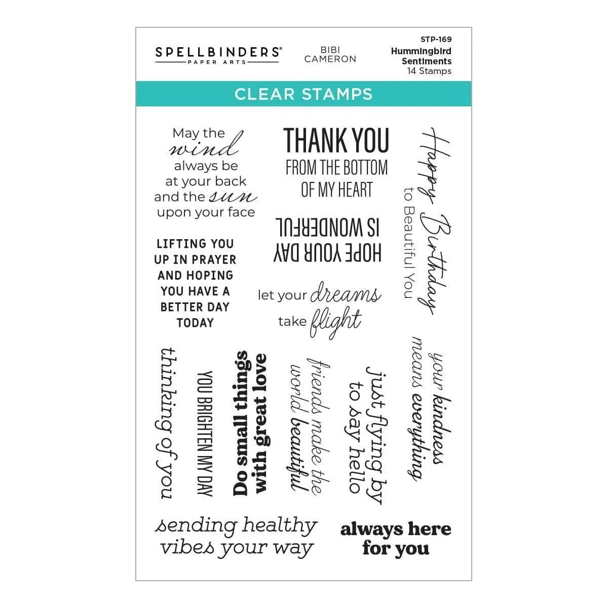 Hummingbird Sentiments Clear Stamps Set is from Bibi’s Hummingbirds Collection by Bibi Cameron with 14 clear stamps in the set. It is full of sentiments and greetings that are uplifting and encouraging. Perfect companion to the offerings in this collection. The stamps work with an acrylic block and made in the U.S.A.