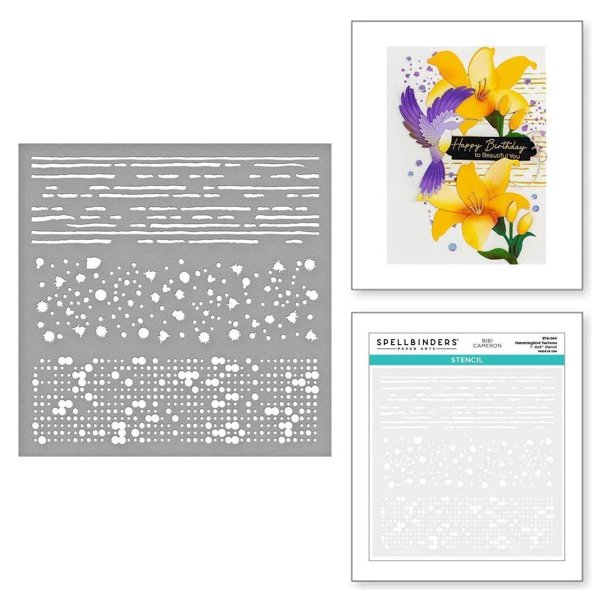 Hummingbird Textures Stencil is from Bibi’s Hummingbirds Collection by Bibi Cameron. It’s a 6 x 6-inch mylar stencil sheet that has three different background designs. Each has a distinctive pattern: lines, random dots, and a dots grid. Add them individually or a combination for a contemporary backdrop or to add movement behind the hummingbird. It’s a fun addition for your creative needs!