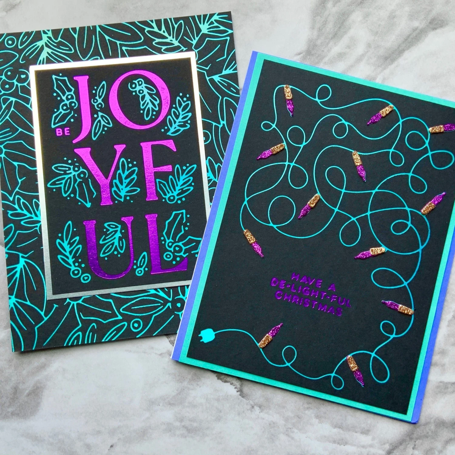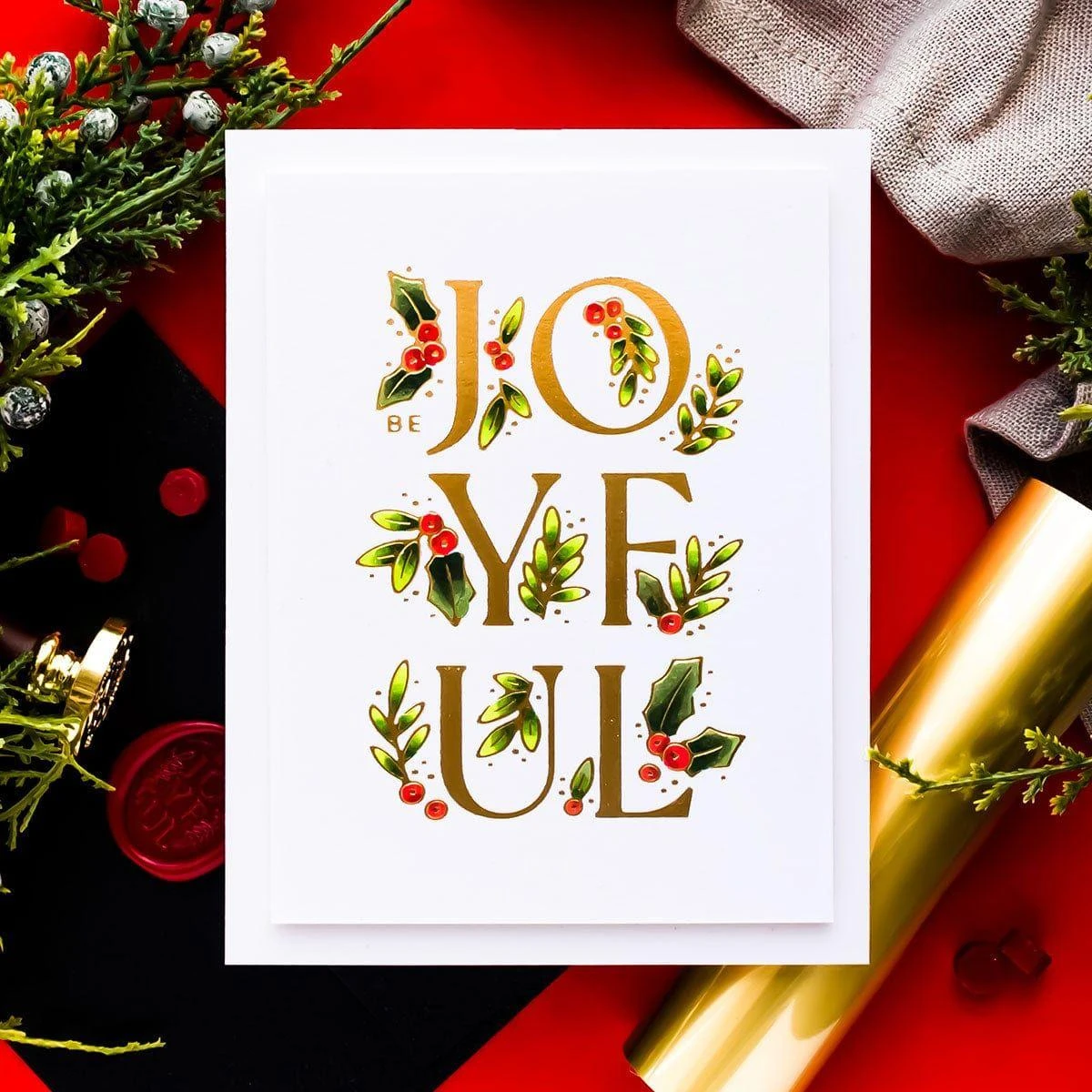 Joyful Glimmer Hot Foil Plate is from the De-Light-Ful Collection by Yana Smakula and comes in a set of two plates. The Be Joyful plate is an uppercase font with the Joyful placed vertically and the Be is subtly right by the J. The second plate is perfectly positioned to add greenery to the Joyful word for a festive look. A beautiful and classic look for a card front!