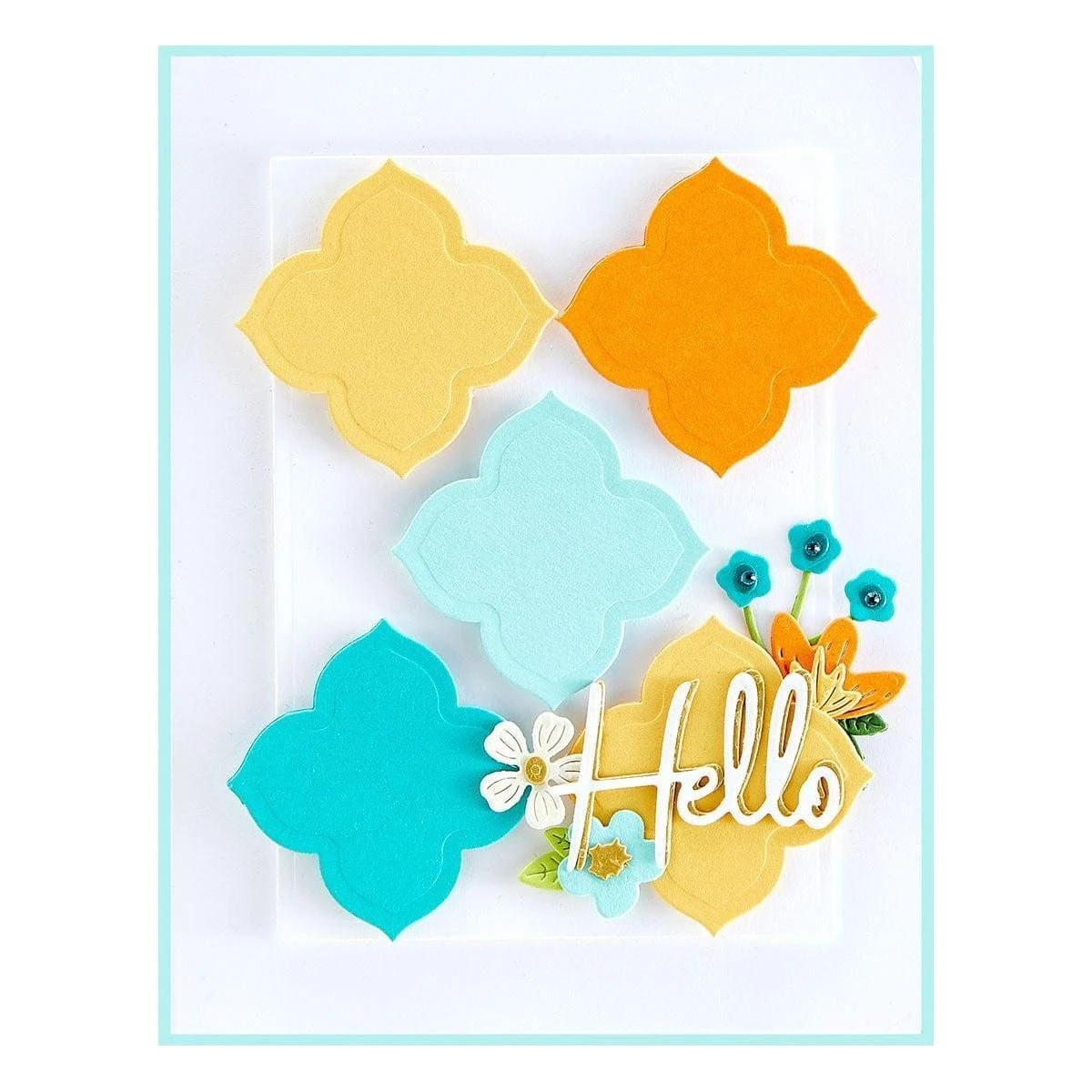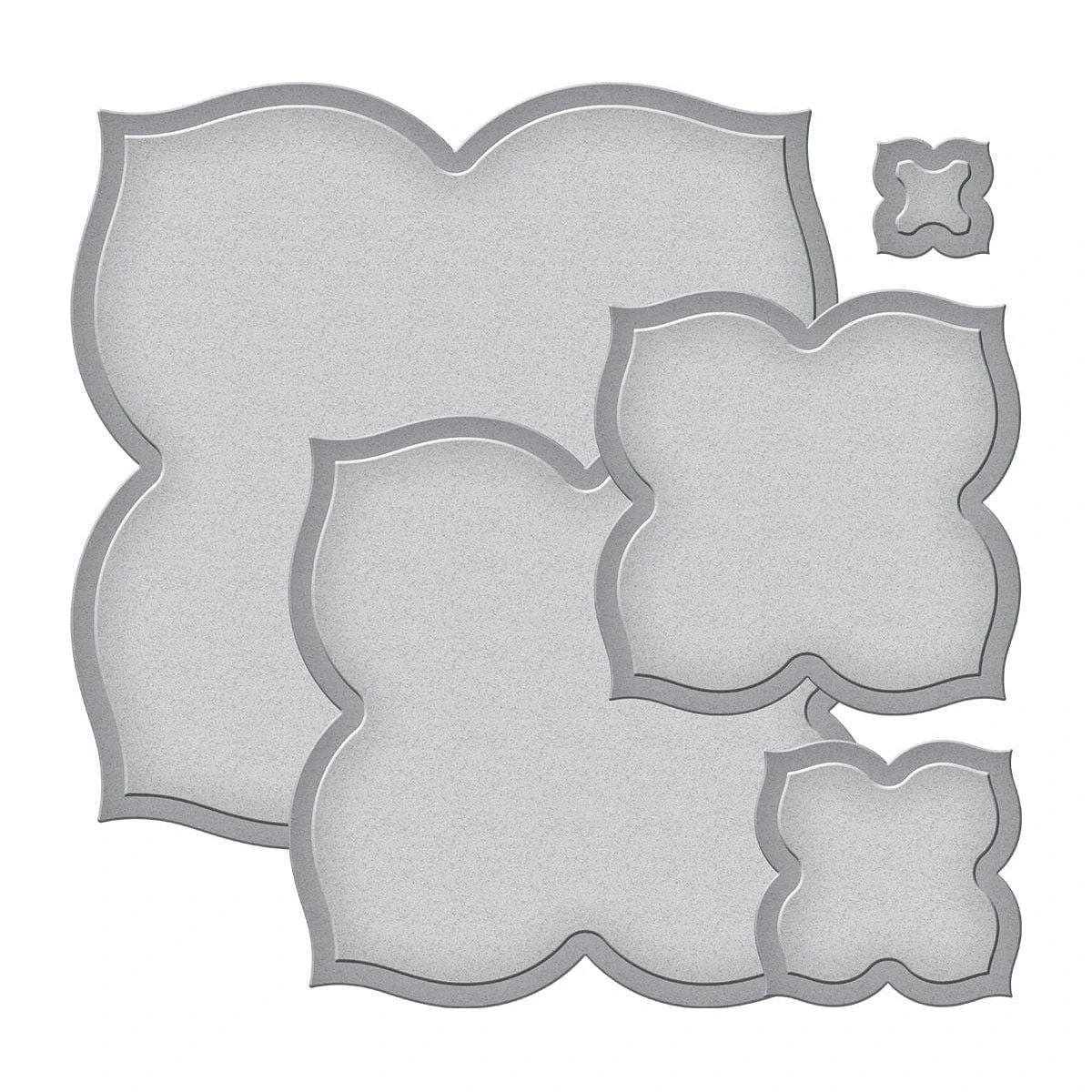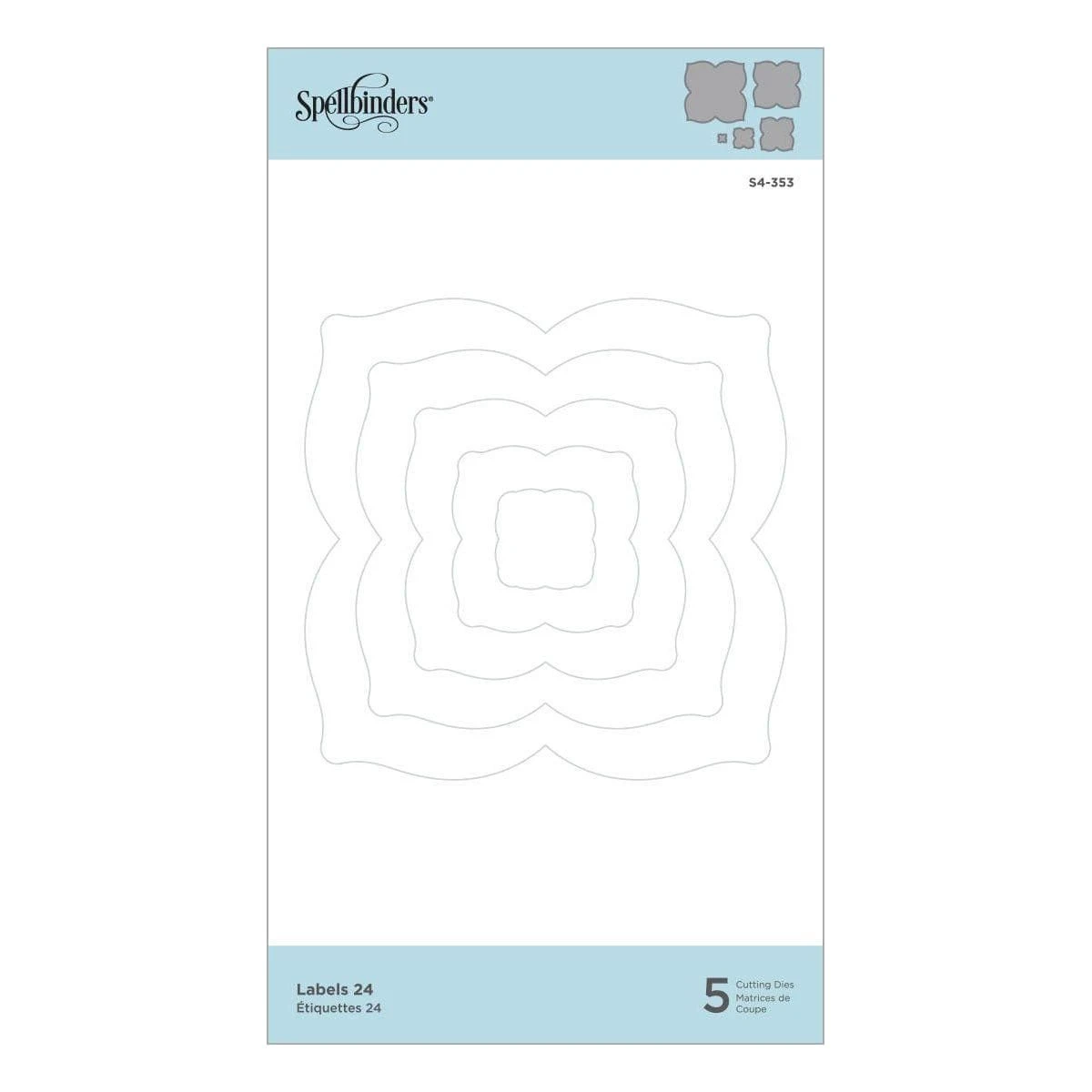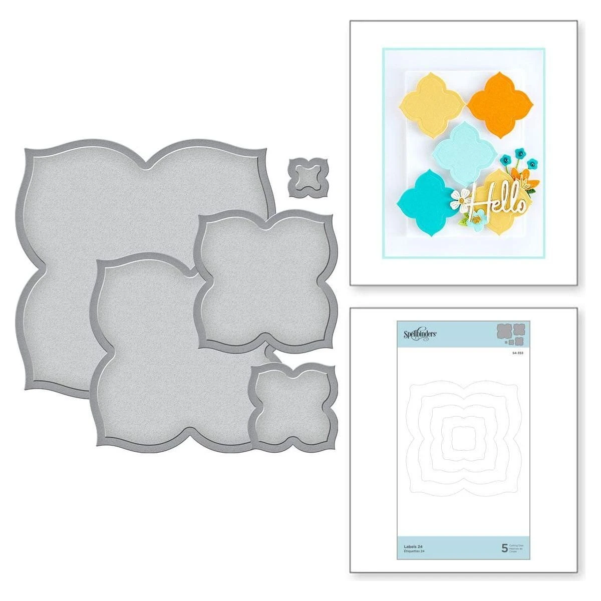 New Again! Labels 24 Etched Dies was the 24th die set designed by Spellbinders in the classic decorative nestabilities style. Contains five cutting dies (not 24). This set features a ornamental shape reminiscent of Moroccan design. The cuts create tile like shapes. Nest for elegant frames, or can be used individually, with stamped images or embellishments in the center square. Spellbinders® Nestabilities® Decorative Elements dies cut, emboss and stencil with a single die template.