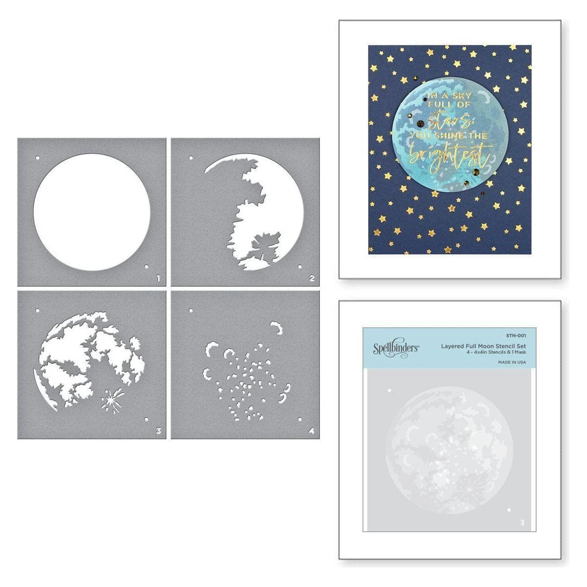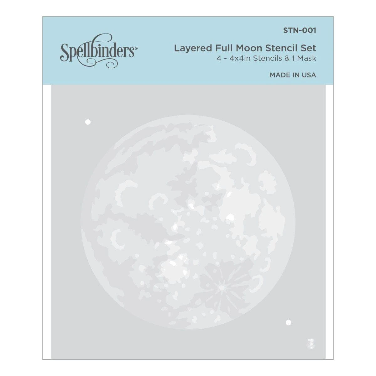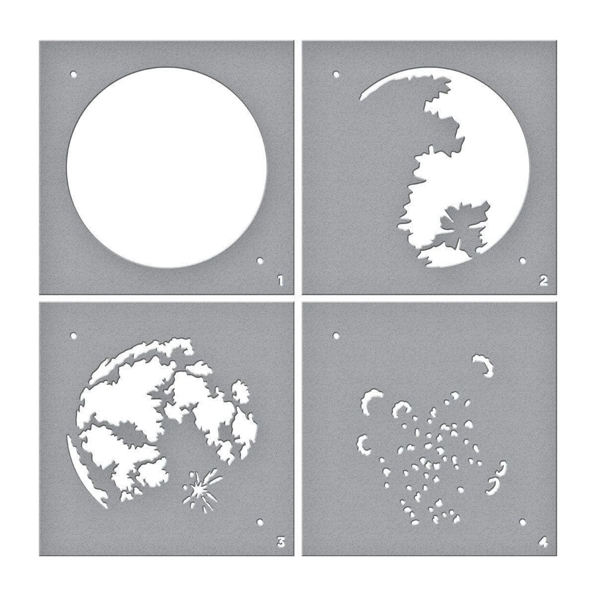 The Layered Full Moon Stencil is part of the Celestial Zodiacs Collection. This set of 4- 4 x 4″ mylar stencil sheets when used in layers create a dimensional moon design. It creates a 3.125-inch (7.94 cm) moon shape. Wonderful to use with inks and paste mediums.