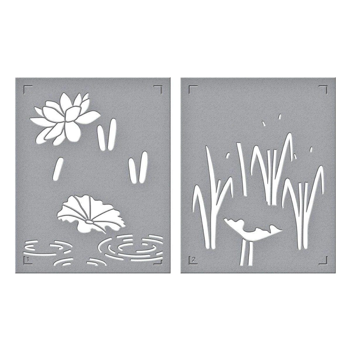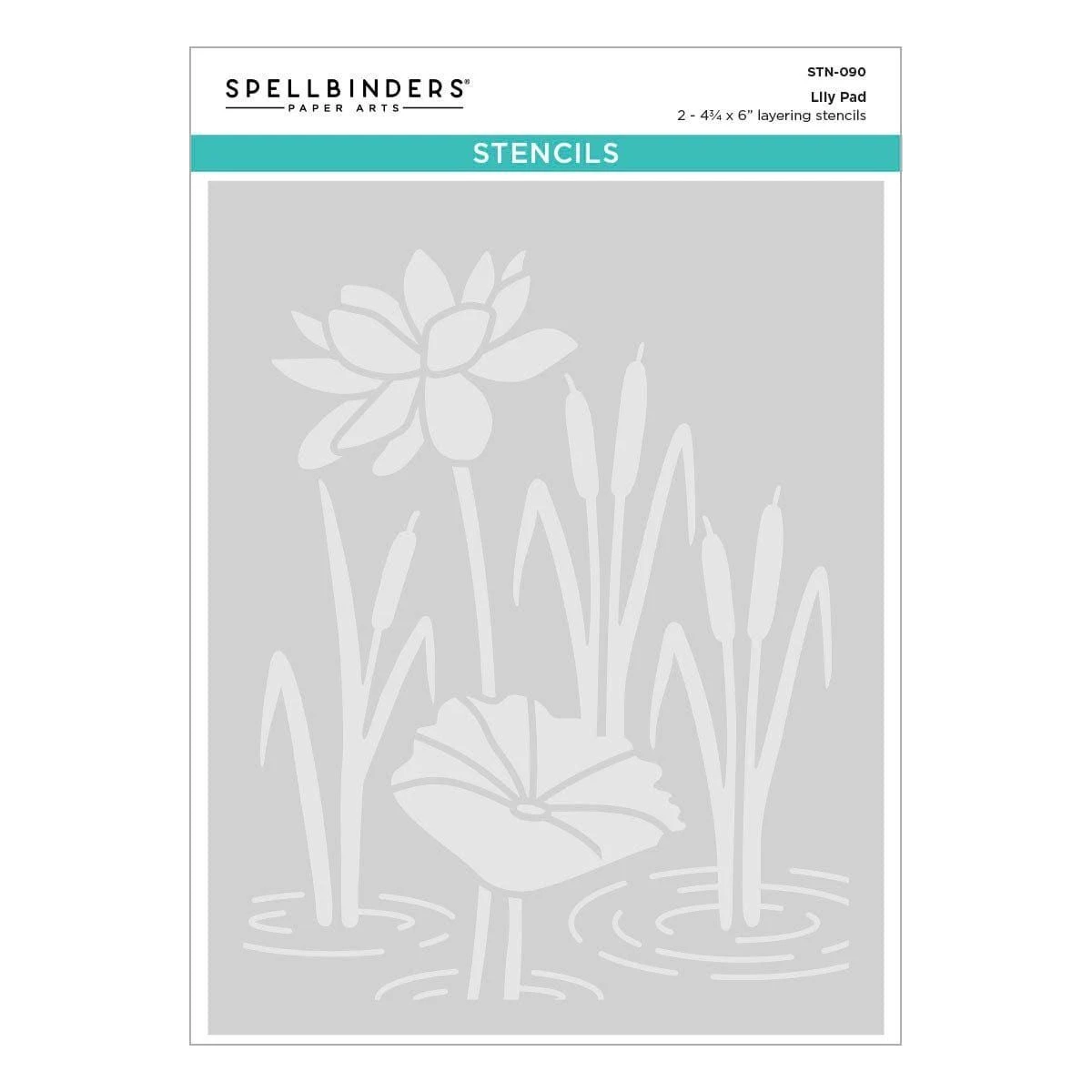 Lily Pad Stencil is part of the Jump for Joy Collection and is made of durable mylar stencil material. The two stencil sheets create a sweet lily pad backdrop where an adorable frog or creature can be found sitting on a flower pad. It includes cattails, a full bloom lily and water ring ripples…lots of details!