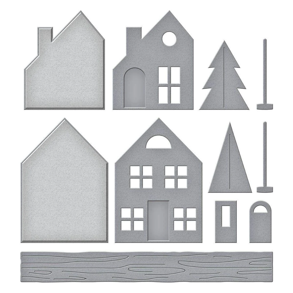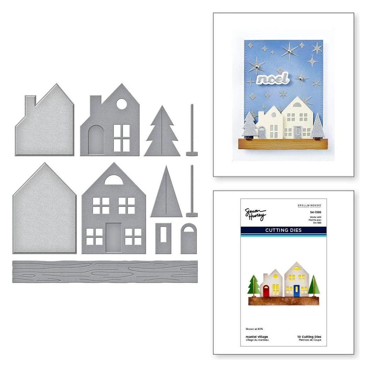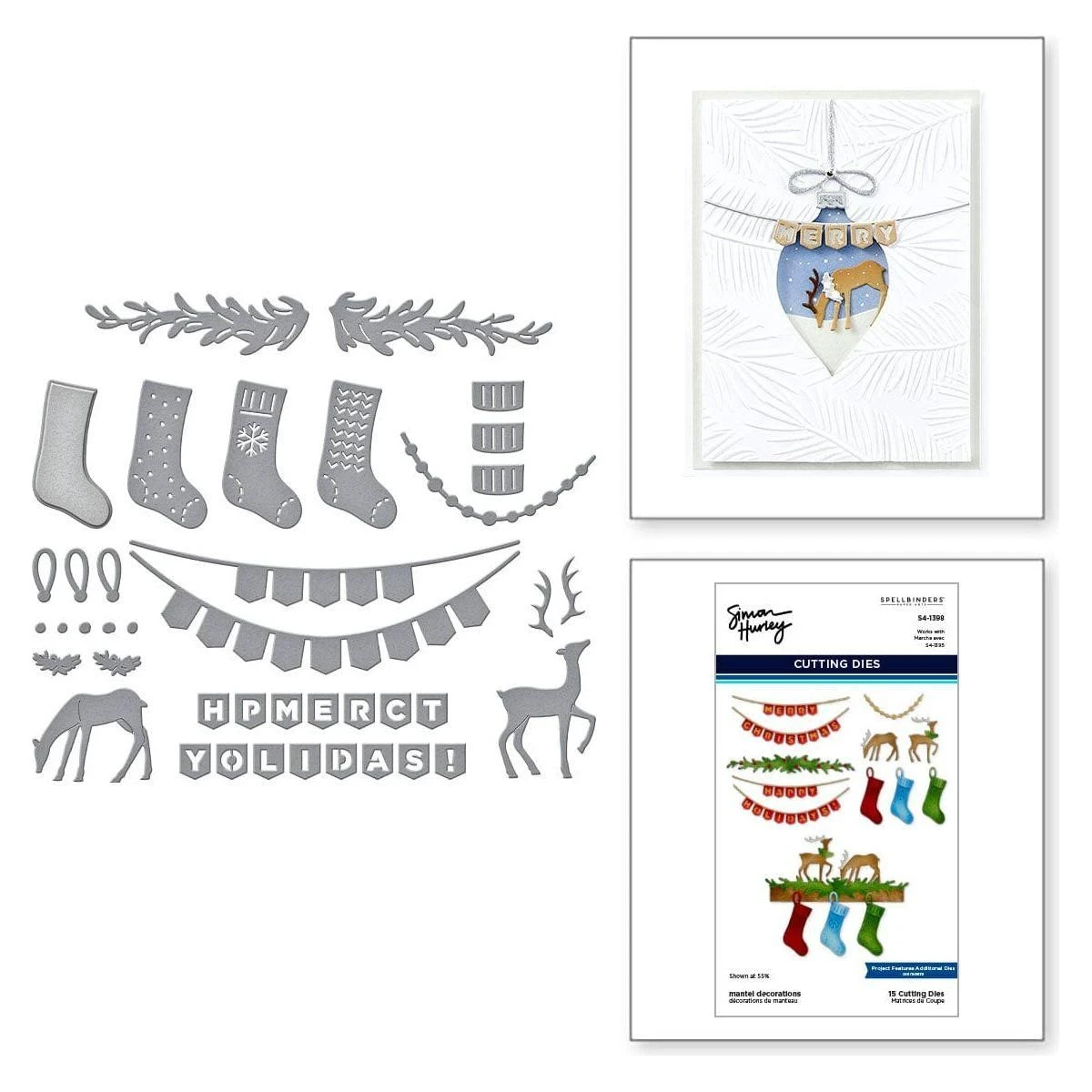 Mantel Village and Decorations Die Bundle is from the Timeless Trees Collection by Simon Hurley. Create a sweet winter village on a wood mantel and decorate it with lots of fun seasonal accessories. The Mantel Village set includes two house shapes with insert dies for door and window details as well as two trees and of course, the mantel! After building this adorable base, add a banner and garland, deer and stockings to the Christmas scene.